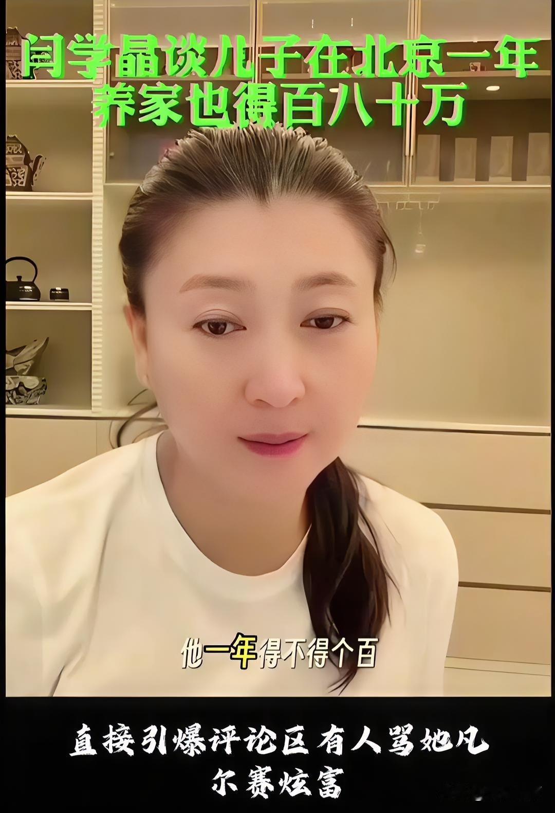 惊呆了所有人 闫学晶直播卖惨,谈自己32岁儿子在北京一年才挣几十万,却要承担百八十万的家庭重担。儿媳从事音乐剧工资也比较低,感叹两孩子生活太难了。 不得不说,人与人之间的价值观差距太大了。 如果一年挣几十万叫生活太难了,那普通老百姓的生活应该叫什么? 就这样的家庭收入,还有必要在网上哭穷卖惨吗?就问她敢不敢晒晒自家的房产和存款吗? 就是不知道明星嘴里的穷到底是用什么单位来衡量的? 阎学晶