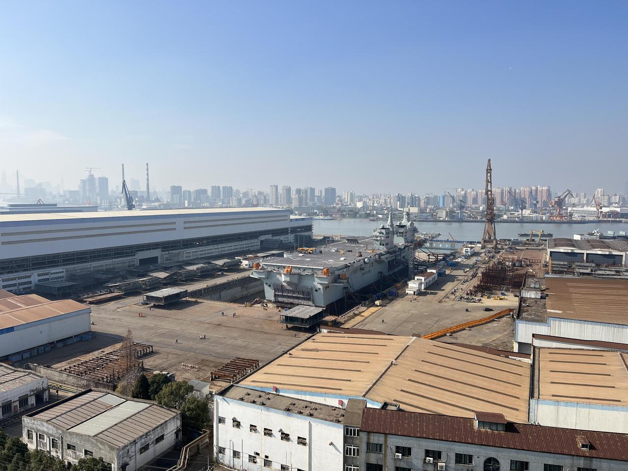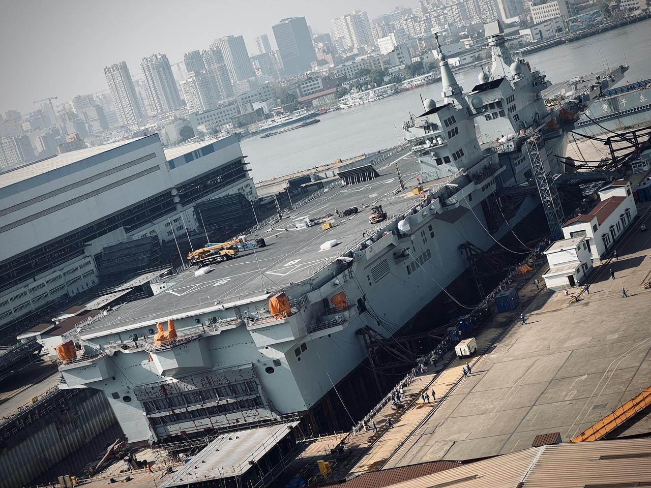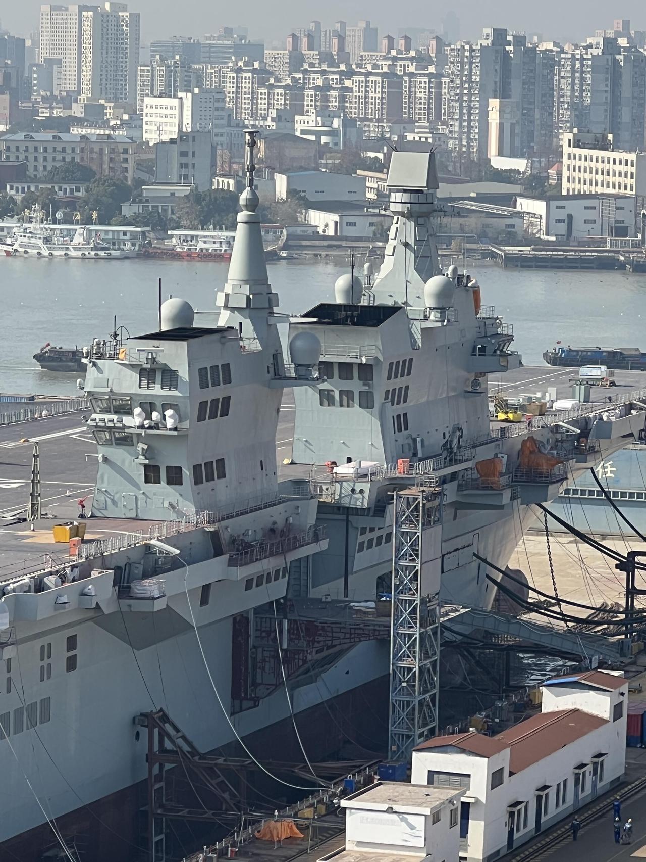 四川舰新图,起飞区挡焰板升起! (图源见水印) 这应该是四川舰第二次海试后,第一张爆出来的甲板照片,可以看到飞行区的挡焰板竖起来了。同时还有不少工程车辆,估计是为了把第二款无人机模型吊到甲板上。再准备准备就开始进行第三次海试。
