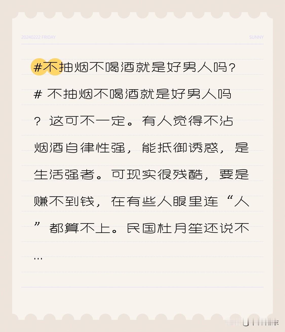 不抽烟不喝酒就是好男人吗?这可不一定。有人觉得不沾烟酒自律性强,能抵御诱惑,是生活强者。可现实很残酷,要是赚不到钱,在有些人眼里连“人”都算不上。民国杜月笙还说不抽烟喝酒的男人自私难托付。所以啊,好男人不能只看烟酒,得综合衡量!