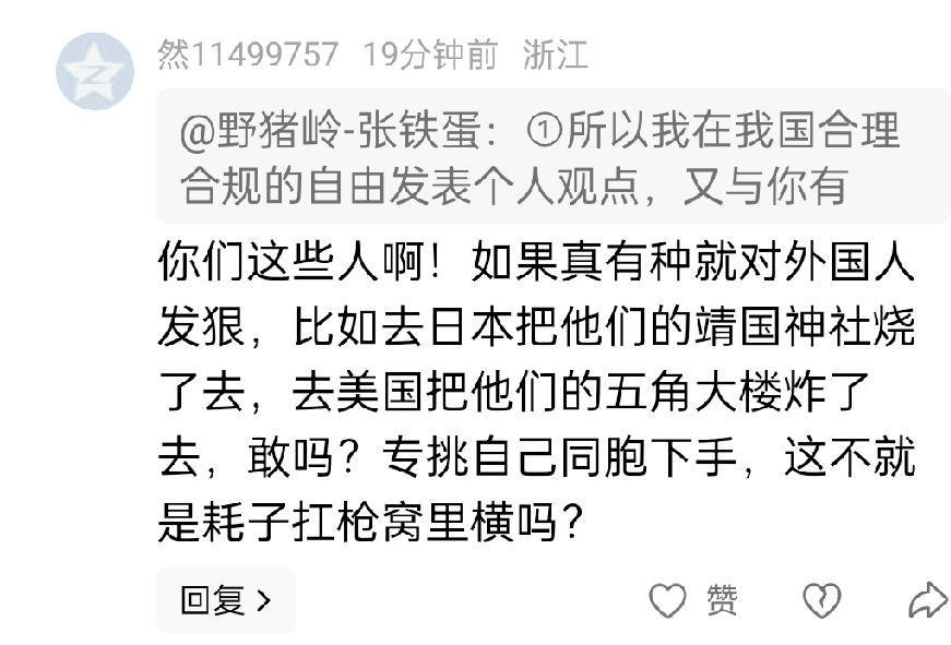~答论“洋胎盘”的反常逻辑~ 驳论下图: ①你们这些人除有一张自以为是、胡说八道、毫无逻辑、无脑跪舔洗白的嘴外,啥也不是。 ②我为什么要去炸美日的某处建筑,难道炸了就代美日被打败了吗?听听这是正常人能逻辑出来的道理吗? ③如果炸了就代表能,麻烦去通知下美日,爷立马出发,说到做到。 ④国家级的搏弈从来都不是一个人、一下子的事,而是整个民族步步图之的事,这是常识,不知道吗?为什么逻辑出一人去敌一国的这种反智道理? ⑤再说你算哪门子的同胞,你把你对华对美的历史态度拿去给广大的中国人民看看,看他们认不认为你是同胞?承不承认你是同胞?