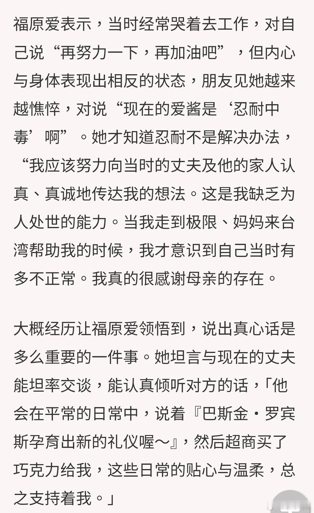 福原爱接受《女性seven》采访谈与江宏杰离婚原因:“现在回想起来,是我自己还不成熟吧。当时觉得沟通上有困难,常常没能把自己的想法表达给对方,就这样放弃了……彼此之间无法商量任何事,夫妻关系在结婚后马上就破裂了。”并称在台湾的婚姻很艰辛,自己的妈妈无法见到孩子。福原爱表示,当时常常哭着去工作,对自己说“再努力一下,再加油吧”,但是内心与身体呈现相反的状态,朋友见她越来越憔悴,对她说:“现在的爱酱是‘忍耐中毒’啊。”“我应该努力向当时的丈夫及他的家人好好传达我的想法与真心。是那时的我欠缺为人处世的能力。当我到达极限、妈妈来台湾帮助我的时候,我才意识到自己当时有多不正常。我真的很感谢母亲的存在。”