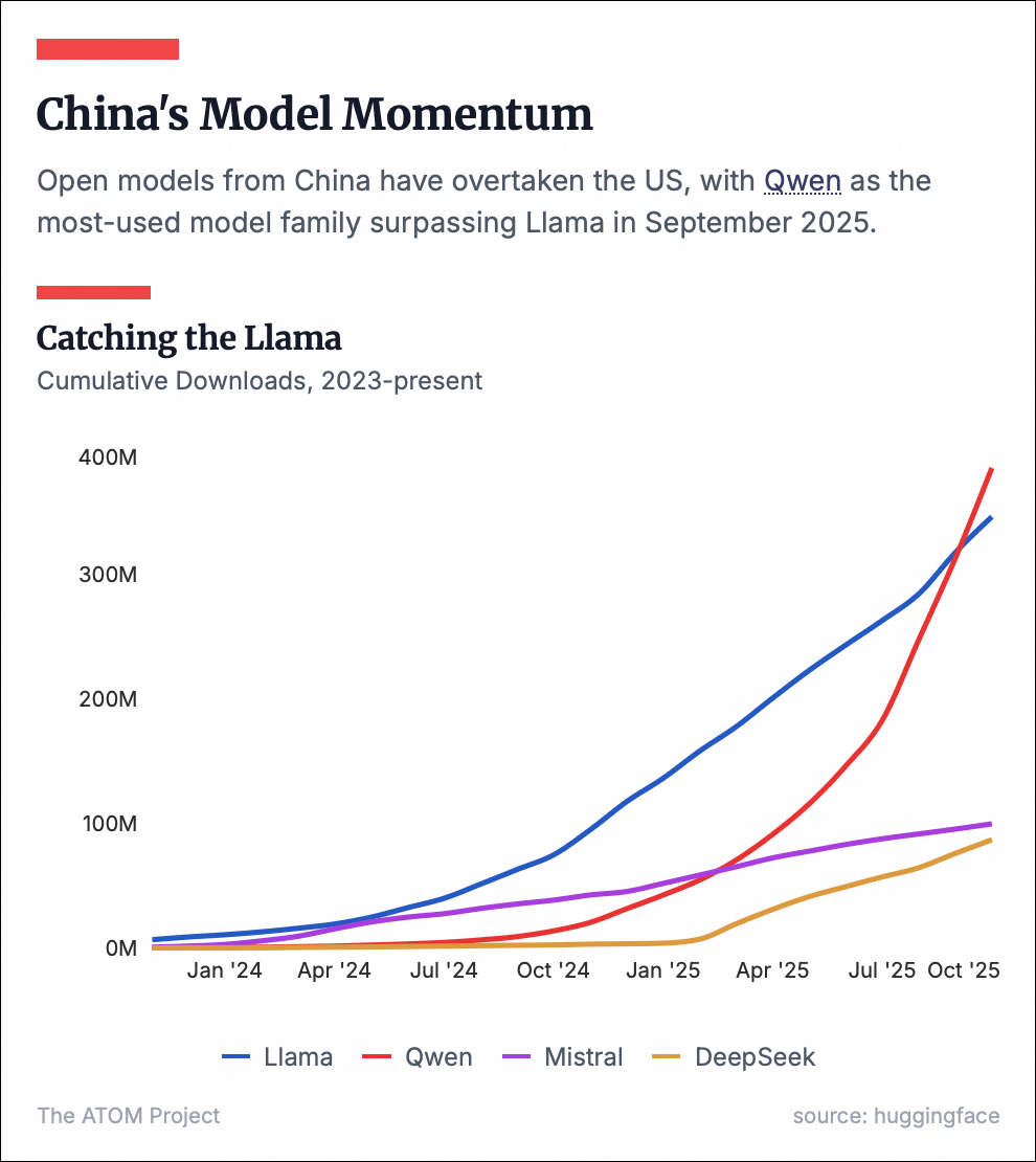 根据全球最大的AI开源社区HuggingFace数据,中国开源模型的下载量在2025年7月已经超过美国,其中阿里千问位居第一;海外模型API调用第三方平台OpenRouter数据也显示,千问在今年异军突起,调用量一度冲至所有开闭源模型的全球第四。