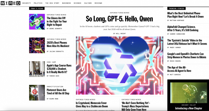 《连线》(WIRED)是全球顶级科技媒体之一,《失控》作者凯文·凯利是该杂志创始主编,《连线》对科技及行业趋势的精准洞察,在硅谷和华尔街享有“数字时代圣经”的美誉。每年年末,《连线》会刊出对全球科技预测的前瞻文章,《再见,GPT-5。你好,千问》即是年终重磅文章系列之一。