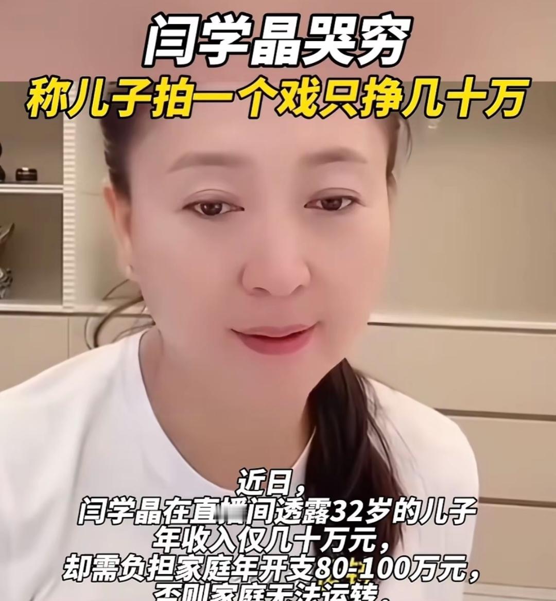 闫学晶直播哭穷,我忍了, 她说100万一年不够用,我也认了, 可我实在是忍不了,她居然卖惨说,三天没吃燕窝了! 看了她的直播,嫁了富豪老公,还要在直播的时候哭穷,儿子一年就拍一部戏,赚的一百万都不够用! 普通人每天加班,一年都赚不了一百万! 更过分的是,她说自己三天没吃燕窝了! 燕窝是啥啊,我都三十多年都没吃过燕窝了,见都没见过! 这个世界是颠了吗,一个大明星,一天就能赚普通人一个月的工资,居然冲着网友哭穷! 她真该学学赵丽蓉老师晚年骑自行车,参加春晚,也该学学陈道明,不参加综艺,不捞钱! 本来可以体面的老去,何必自毁长城!