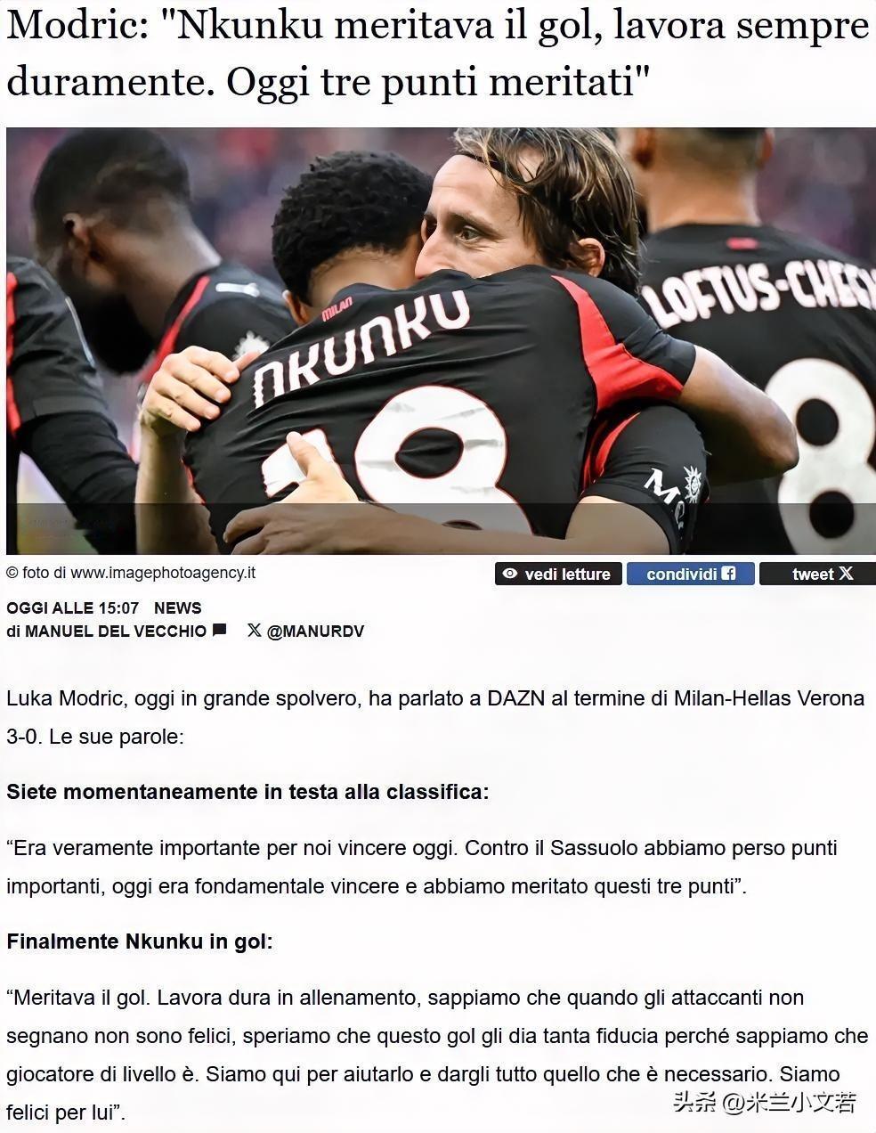 莫德里奇!莫德里奇接受采访表示恩昆库配得上进球,你们不知道他在训练中付出了多少努力。希望这个进球能给他带来巨大的自信,因为我们都清楚他的水平有多高。同时莫德里奇也谈到了点球问题,莫德里奇说米兰的点球手确实是普利西奇,但当时普利西奇脚踝有些不适,是阿莱格里要求我们决定的,恩昆库承担了责任,他展现了勇气。 莫德里奇在米兰-维罗纳赛后接受采访表示恩昆库终于进球了,这是全队都在期待的事情,他配得上更多的进球,他在训练中非常努力,我们都知道当前锋不进球时,他们是不会开心的,但我们清楚恩昆库的实力,所以全队都坚信他的进球会很快到来,同时我们也清楚,当恩昆库卸掉压力后,他的进球将源源不断的到来。 莫德里奇就是米兰的政委,球场之上莫德里奇以身作则,每场11公里是标配,40多拿够欧冠捧金球还在拼,30不到的小伙子队友们好意思凭啥躺平。训练中球员训练他操心,会经常与队友交流,分享自己的经验,球场下球员心理安抚他也负责,恩昆库他这样说,如果是希门尼斯进球了,莫德里奇肯定也是这套磕,明显这是给恩昆库打气的话,西多夫以后貌似最适合的政委是阿德利,但哥们场上差点,莫德里奇场上场下真的太适合了。