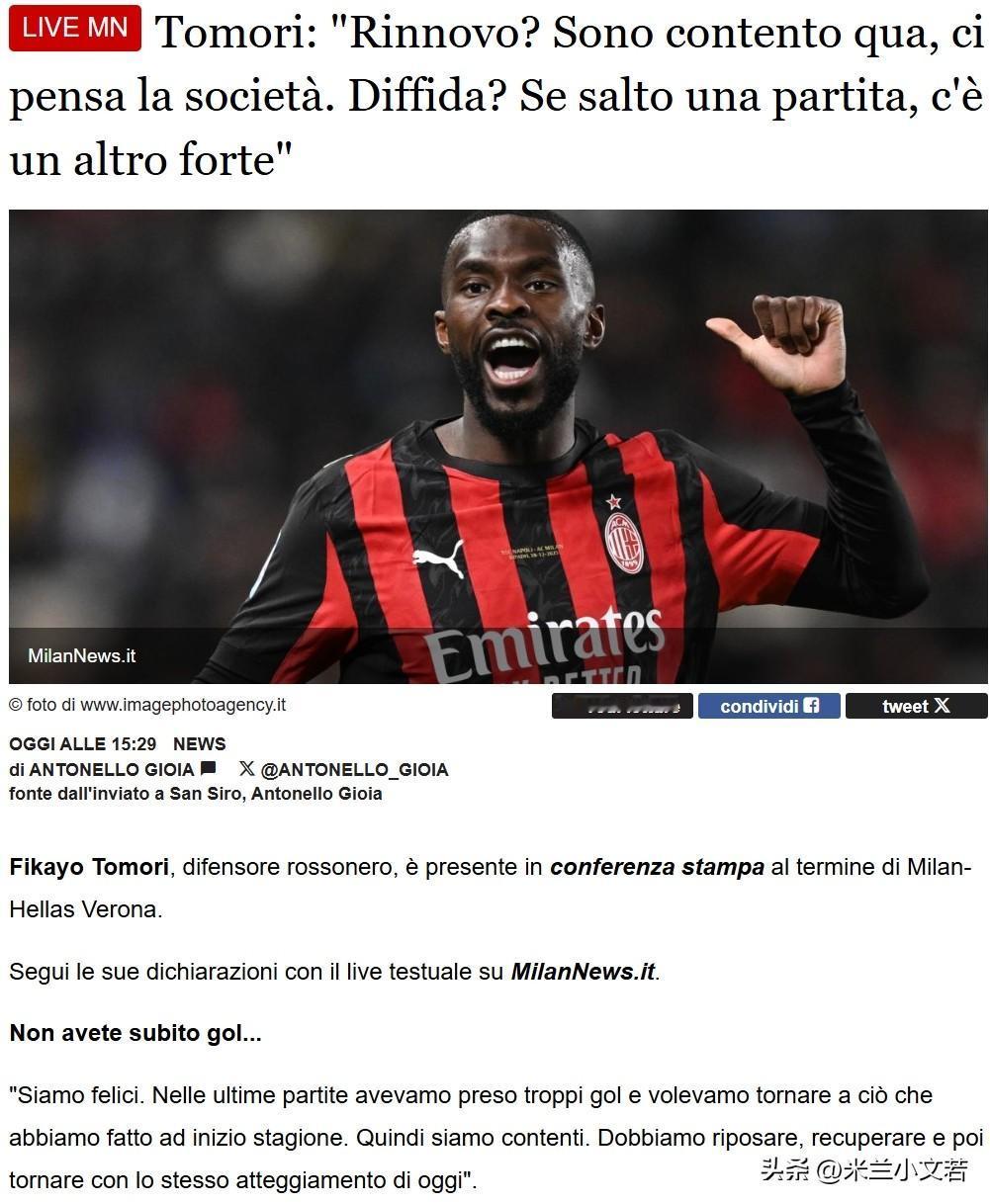 托莫里再次喊话米兰,我爱米兰!托莫里接受采访表示续约问题不要来问我,这是经纪人的工作,我能说的只有我爱米兰,我愿意永远留在球队。 记者提问托莫里续约情况,托莫里续约比萨勒马克尔斯要早,就算不早也基本是同步的,但萨勒马克尔斯续约都官宣好久了,托莫里却一直没有动静,个人觉得这个记者问题虽然有点刁钻,但问的没毛病,为啥还没签字?个人想法,估计是合同细节没办法谈妥,不是合同细节没谈妥,是没办法谈妥。 还记得咱们的队长卡拉布里亚不,当时米兰也愿意与卡拉布里亚续约,但给出的条件是延长合同一年,工资不变,我大舅哥是队长啊,才28岁,这样的条件不是羞辱是啥?所以卡拉布里亚经纪人不答应是正常的,但谈判没有了讨论的基础,后来就被关闭了,米兰给托莫里续约条件差不多,同样是自动延续,工资不变,不同的是延续一年半,托莫里27岁,当打之年,在米兰之前可以说比较优秀,现在算表现中规中矩,这样的续约条件怎么可能有结果,所以个人觉得是没办法谈妥。