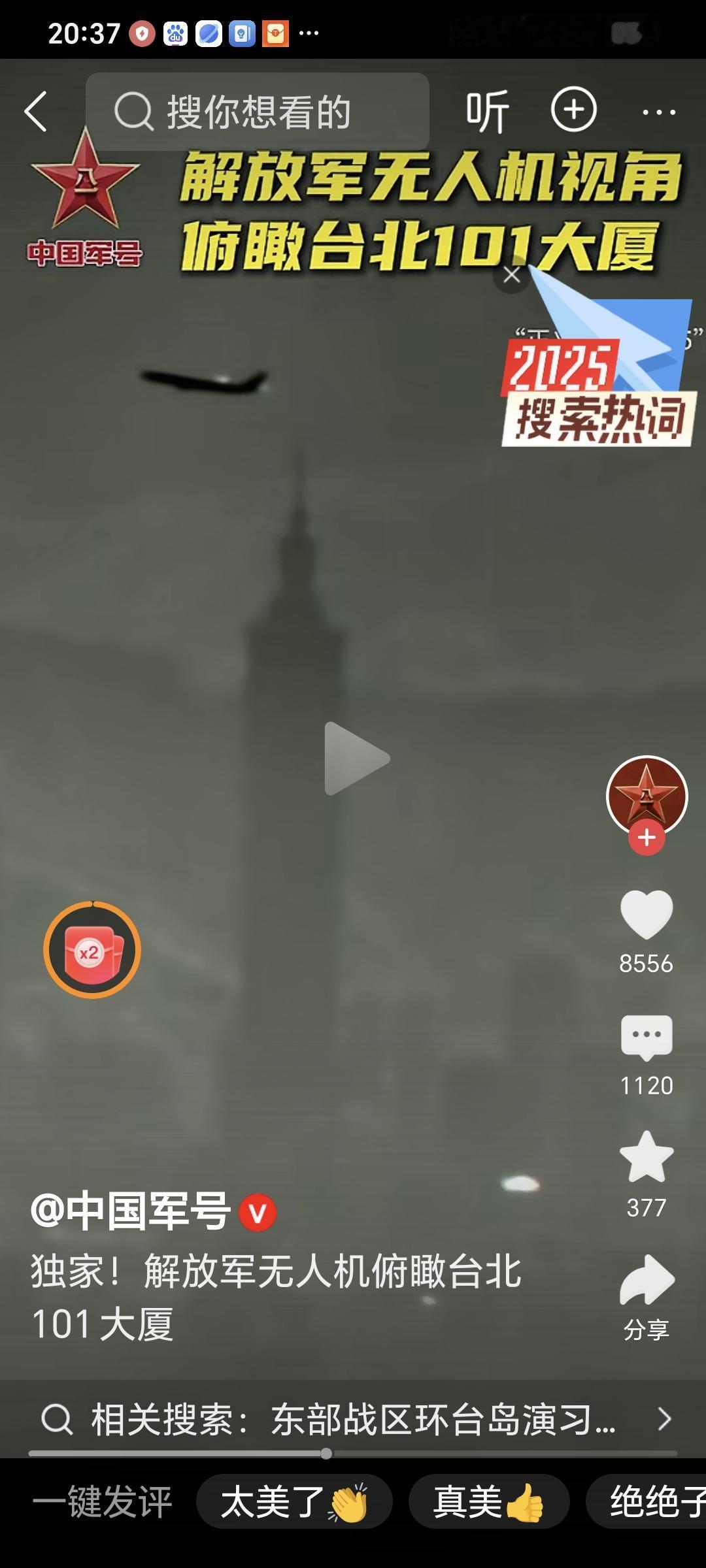 解放军无人机俯瞰台北101大厦 29日晚,中国军号发布军事演习最新画面,解放军无人机视角下的台北101大厦。 网友,从高空掠过101的不仅是无人机,更是“祖国统一”的倒计时钟,每帧画面都在说:两岸一家,团圆从不是选择题,是必然结局!今天(2025.12.29)央视新闻联播中就有这样子的视频画面,今生应该有幸坐着高铁去逛逛台湾的101大厦!无人机视角下的台北101,见证着中国军队维护国家统一的坚定决心,任何“台独”幻想,在绝对实力面前都不堪一击。