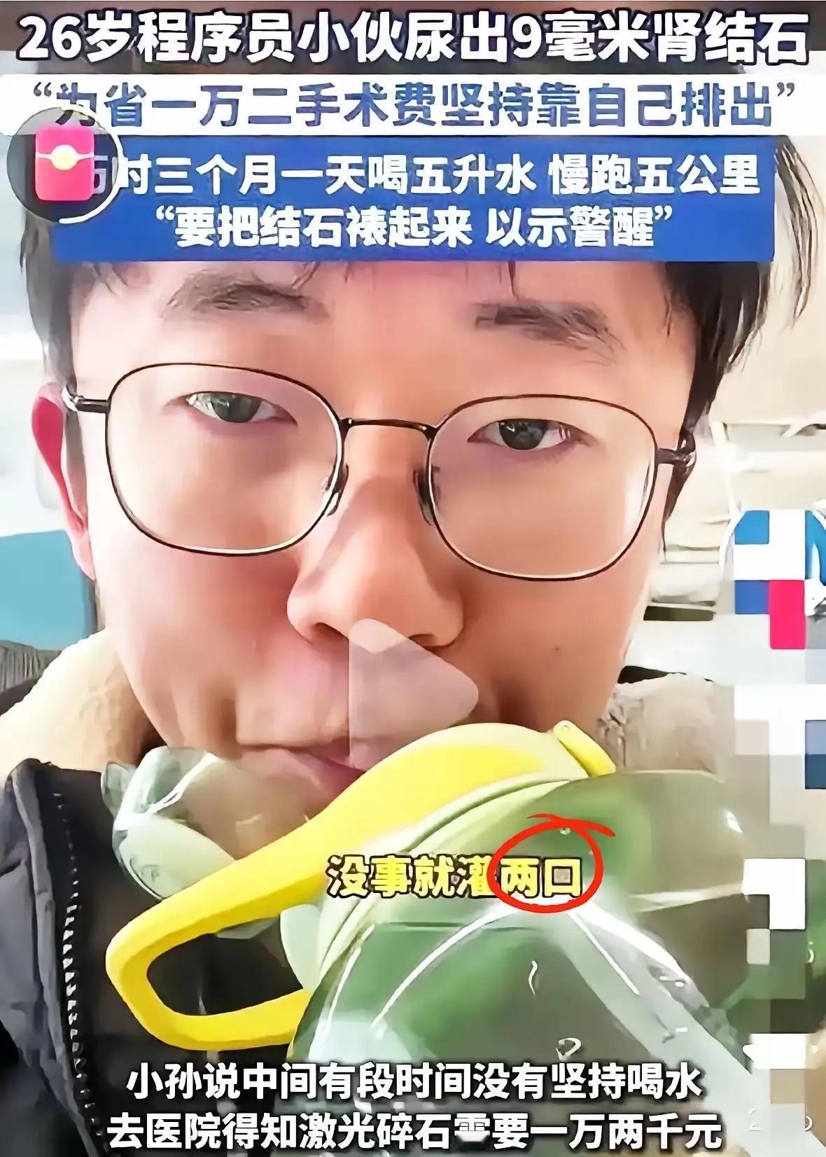 近日山东一26岁小伙为了省一万多的手术费,听了医生的建议,每天坚持喝5升水以上,并慢跑5公里,历时三个月,硬生生把直径9毫米的肾结石尿了出来。 这位小伙姓孙,是一名扎根互联网行业的程序员,26岁的年纪,已经在敲代码的岗位上摸爬了近四年。程序员的工作特性,让他每天至少有十个小时坐在电脑前,敲代码、改bug、赶项目进度成了日常,常常忙起来连起身接杯水的功夫都没有,白开水成了办公桌最被忽略的饮品,取而代之的是咖啡、碳酸饮料这类能快速提神的饮品。 孙小伙最初发现身体不对劲,是一次赶项目后的剧烈腰痛。疼得直不起腰,冷汗顺着后背往下淌,同事赶紧送他去医院,CT结果显示右肾有一颗9毫米的结石,医生建议体外冲击波碎石,费用大概12000元。刚工作四年的他,还背着房租和车贷,这笔钱对他来说不是小数目,他咬着牙问医生有没有更省钱的办法。医生检查后发现结石位置较浅、形态光滑,没有引发肾积水,才谨慎建议可以尝试保守治疗,但反复强调要定期复查,一旦出现疼痛加剧必须立刻就医。 那段时间,他的办公桌成了办公室的“风景线”。1.5升的大水桶天天摆在桌角,上午雷打不动喝半桶,下午喝完剩下的,晚上回家再兑着温水补1升,逼自己小口多次喝,避免一次性灌下去肠胃难受。一开始频繁跑厕所,同事还开玩笑说他“带薪摸鱼”,只有他知道,每一次起身都是在为健康努力。慢跑更是考验毅力,他下班常常已经晚上九点,累得只想瘫倒,却还是换上运动鞋绕着小区跑5公里,冬天的清晨天还没亮,他裹着羽绒服在寒风中奔跑,呼出的白气瞬间消散,膝盖疼了就贴块膏药,从没间断过。有好几次,他喝得恶心头晕,跑到腿软,想过放弃直接手术,可一想到银行卡余额,又咬牙坚持了下来。 三个月后的那天,他在厕所突然发现排出了一颗米粒大小的硬物,赶紧拿去医院检查,医生确认就是那颗9毫米的结石时,他瞬间红了眼眶。但这份“奇迹”背后,藏着不少风险。上海交大医学院附属仁济医院的专家就明确表示,9毫米结石自然排出的概率仅20%,通常6毫米以下才推荐保守治疗,盲目大量饮水可能导致电解质紊乱,引发低钾、低钠等问题,若结石嵌顿造成尿路梗阻,还可能损伤肾功能。孙小伙的成功,离不开结石位置和形态的幸运因素,更离不开医生的专业评估,普通人绝不能随意模仿。 他的经历,戳中了无数年轻职场人的痛点。《2023中国程序员健康报告》显示,68%的程序员每日工作时长超过10小时,32%存在严重睡眠障碍,仅15%能保证7小时以上高质量睡眠。而泌尿系结石早已不是中老年专属病,我国发病率已达6%-10%,20-40岁患者占比突破60%,长期饮水不足、久坐不动、用饮料替代白开水,都是主要诱因。像孙小伙这样的程序员,还有司机、外科医生等职业人群,都是结石高发群体,他们为了工作牺牲健康,却往往在生病后才发现,省钱的前提是不能拿生命冒险。 更值得深思的是,12000元的手术费,竟让一个年轻程序员选择耗时三个月的“硬核排石”。这背后是年轻人面临的经济压力,也是部分群体对医疗费用的顾虑。孙小伙说,他不是不想手术,是实在舍不得这笔钱,毕竟房租、车贷加上日常开支,每个月几乎月月光。这种“小病扛、大病拖”的心态,在年轻职场人中并不少见,他们总觉得自己年轻身体扛得住,却忽视了小问题拖成大病的风险,到最后可能花费更多金钱和时间。 孙小伙的故事是幸运的,但这份幸运不能成为忽视健康的借口。年轻不是资本,健康才是,那些被我们忽略的喝水、运动,恰恰是最廉价的健康投资。职场竞争再激烈,也该给自己留一杯水的时间、一段运动的间隙;医疗费用再让人顾虑,也不能拿身体赌运气。希望更多人能从他的经历中醒悟,平衡工作与生活,重视身体发出的每一个信号,毕竟没了健康,所有的努力都失去了意义。 各位读者你们怎么看?欢迎在评论区讨论。