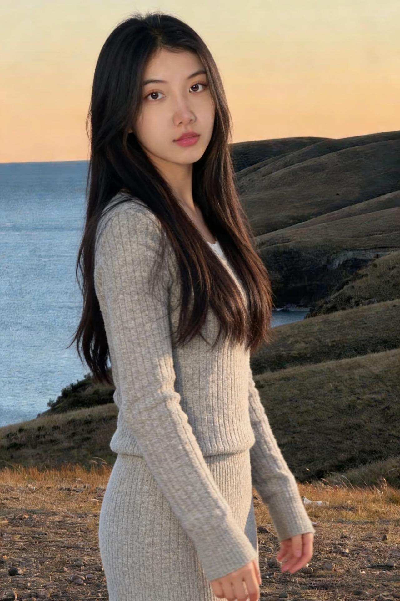 风把海岸线揉成柔软的绸带 她站在黄昏的褶皱里 灰毛衣接住最后一缕橘色的光 长发垂落,像未被惊扰的溪流 ~ 远山把影子沉进海面 浪涛的呼吸轻擦着礁石 她的目光越过水色 停在天与海吻别的地方 ~ 沉默是此刻最好的语言 不必说潮起,不必说日落 只是站着,就成了暮色的一部分 像礁石守着海湾,像风守着旷野 ~ 云在天边慢慢褪色 她的轮廓,是时光按下的温柔快门 风掠过发梢时 带走了人间所有的匆忙