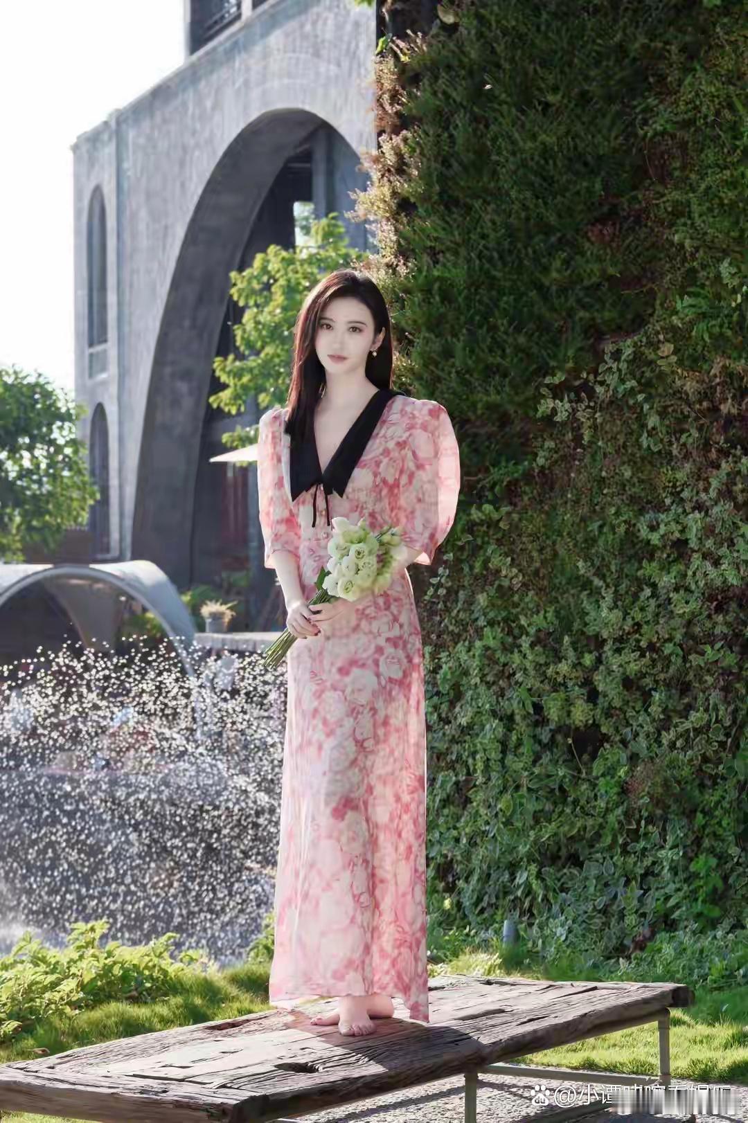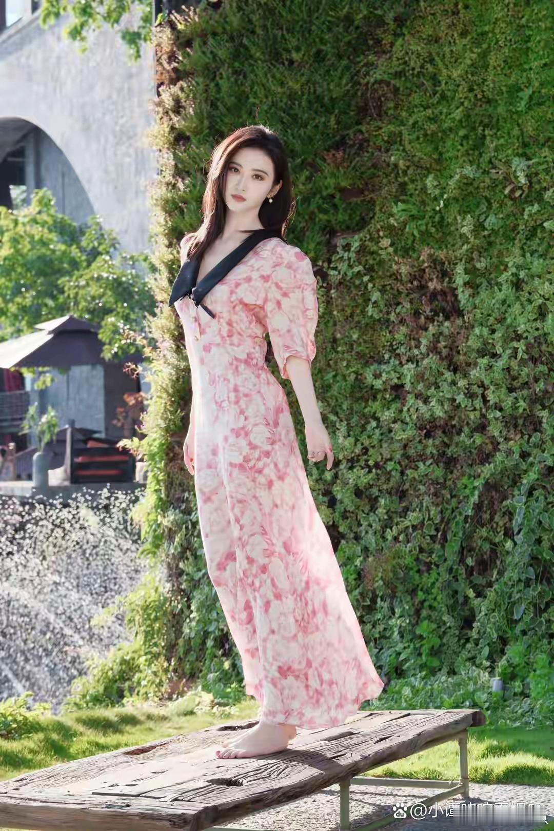 景甜粉色碎花裙赤脚写真太绝,踩木台的模样美成了春日油画!