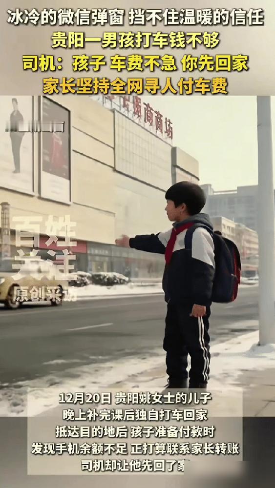 贵州,一个8岁男孩晚上补完课后,独自打车回家,下车要付钱时才发现余额不足,男孩本来打算联系妈妈帮忙,不料司机竟直接放他回家,结局更是暖到了心坎里。 那天孩子到楼下急得直搓手,司机师傅一看天寒地冻的,赶紧摆手:“先回家,钱不着急!”拍了收款码就让孩子走了。谁知道妈妈回家扫码才发现码过期了,愣是联系媒体、发动网友,两天后终于找到了司机。师傅接电话直乐:“就这点事儿还劳心费力找我?”妈妈转完钱连声道谢,师傅也笑着说“应该的”。 这事儿看着普通,倒让我想起最近接送孩子常碰到的司机师傅——凌晨五点就出车,雨天堵车也不抱怨,乘客落下东西比自己丢了还急。他们挣的是辛苦钱,可心里装着热乎气儿。那妈妈更让人佩服,没想着“反正码过期就算了”,偏要给孩子做个样子:欠的钱得还,别人的信任得守。 现在总听人说“现在人越来越精”,可这事儿里的司机和妈妈,偏用最“笨”的方式——司机宁肯担风险先心疼孩子,妈妈宁可麻烦也要守信用。其实哪有什么大道理?不过是人心换人心:你给我一份信任,我还你十分真诚。 咱们中年人看这些,就图个踏实。生活里难免有磕绊,但这些“小事”像小太阳,照得人心里暖乎乎的。希望这样的温暖能多传传,让孩子们长大也知道:这世上,愿意相信你的人,比想象中多得多。