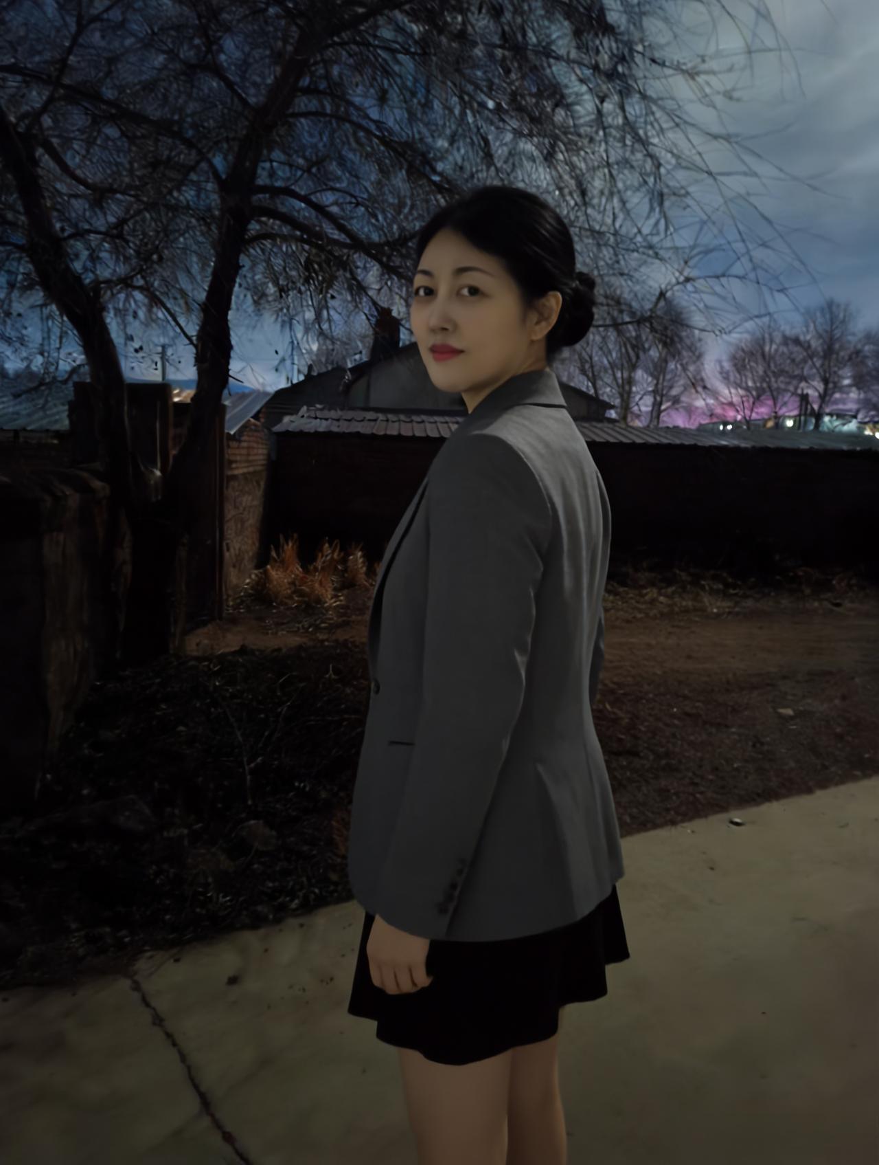 西装裁得夜三分,转面凝眸意自真。 树影横斜灯影里,一身风骨胜芳春。