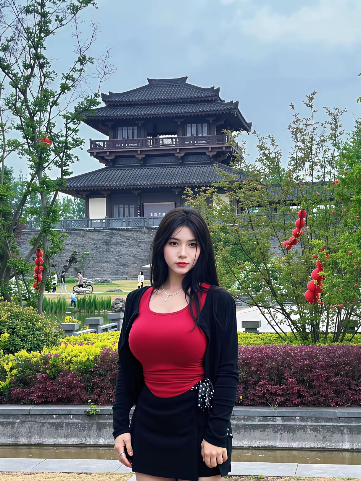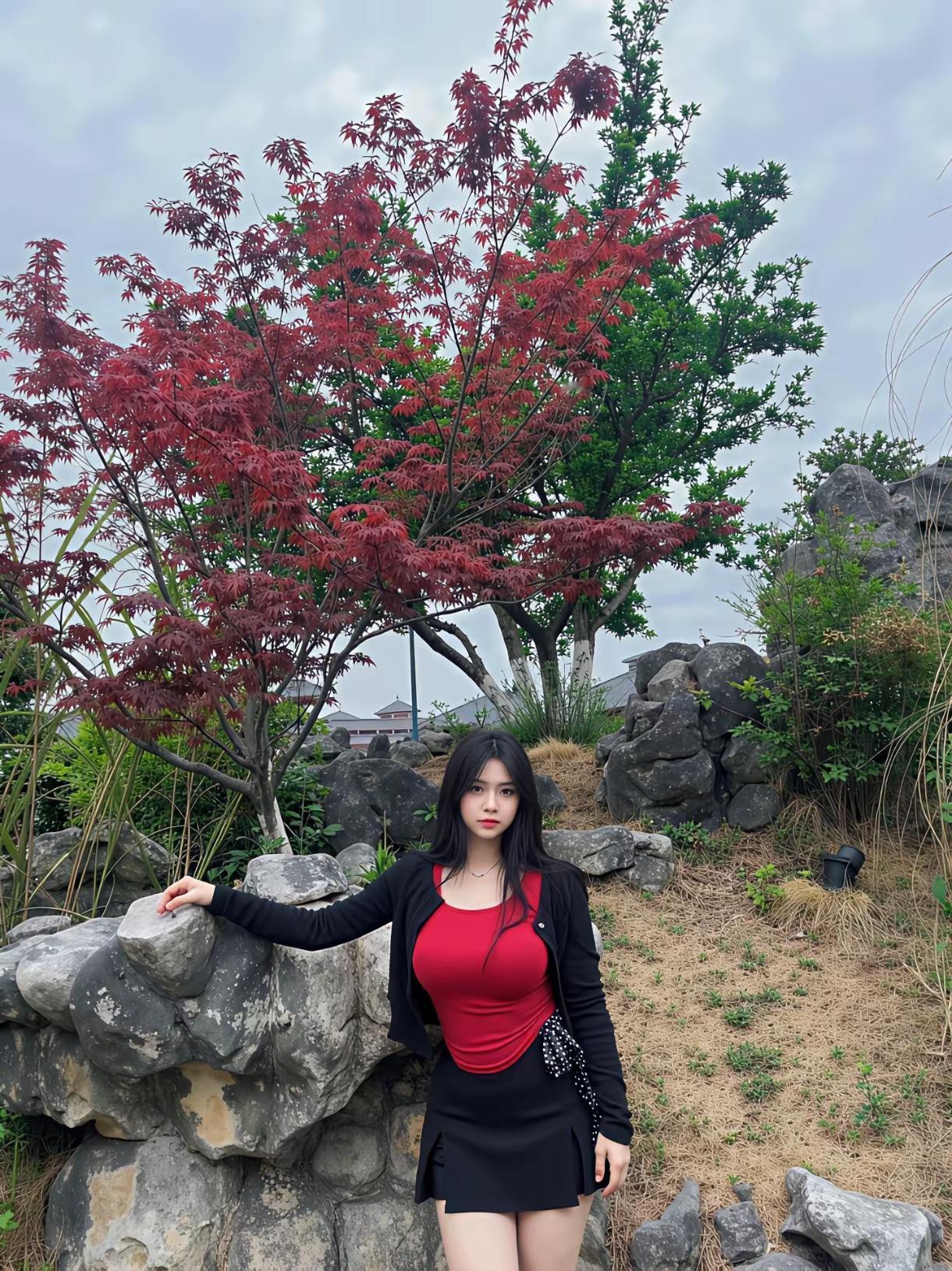 《游园偶记》分享原创诗 晴光染尽小园春,丹叶枫枝衬绛裙。 石畔风轻凭玉腕,亭前檐古落流云。 朱栏漫倚青阴里,画栋斜依软翠分。 半日闲游皆入眼,眉间笑靥胜芳芬。