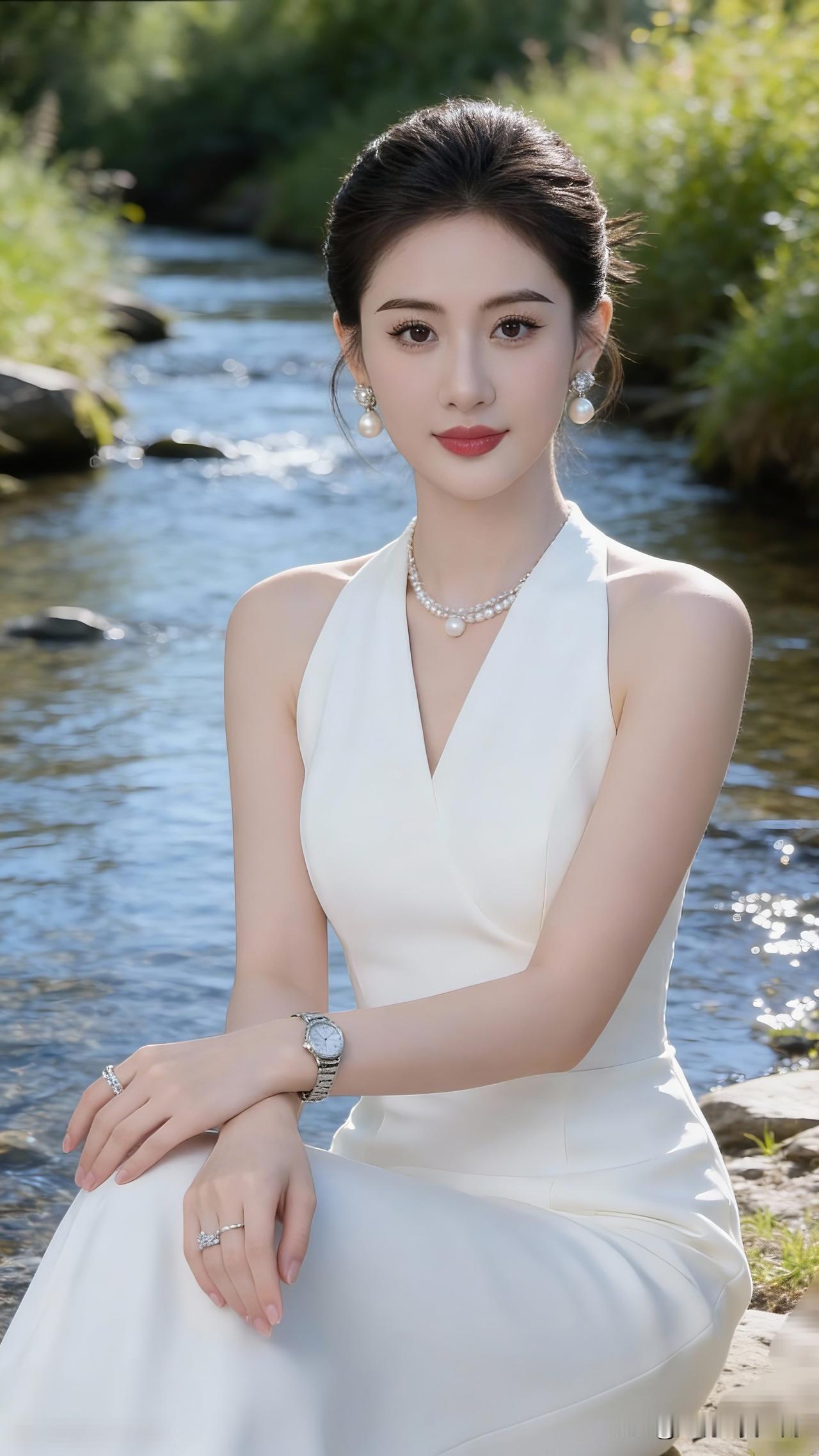 碧水映佳人,玉簪映清波。美女究竟能有多美 优雅白裙,静坐溪边,自然之美