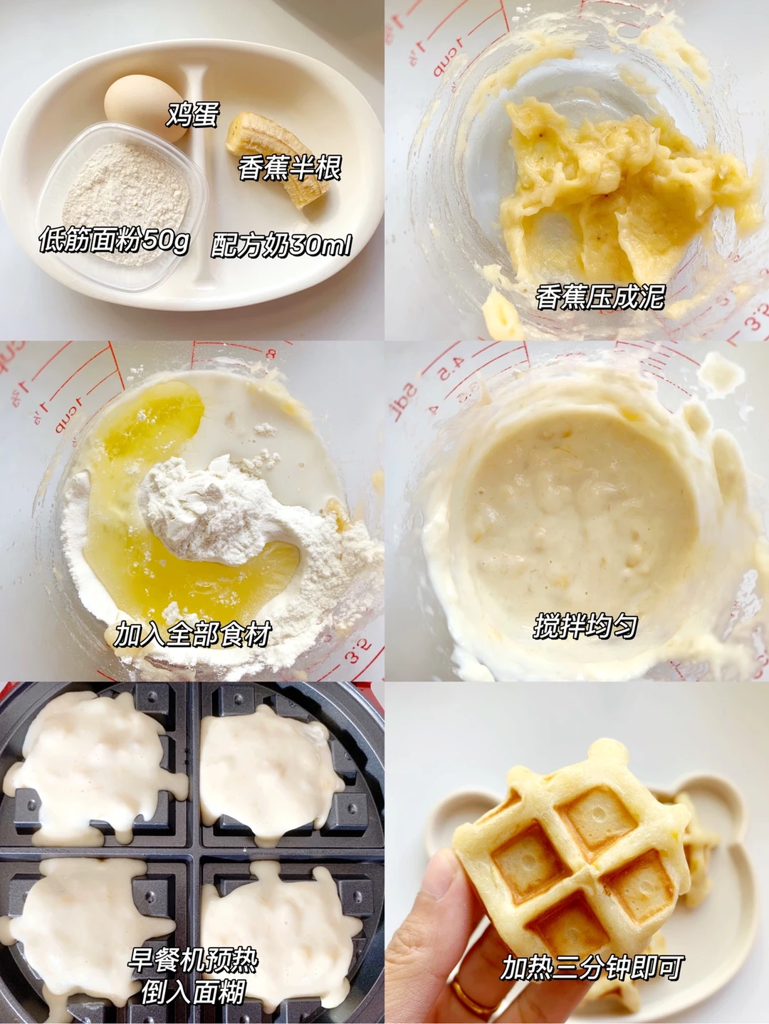 华夫饼不仅做法简单而且也很好吃😋 可以给宝宝当早餐或者点心都很不错哦,香甜可口,超松软,十分钟就可以搞定[赞R][赞R] ~~~~ 🌟食材 香蕉半根、配方奶30毫升、低筋面粉50克,鸡蛋 . 🌟做法: 1⃣️香蕉压成泥,加入全部食材,搅拌均匀 2⃣️早餐机预热,倒入面糊,盖上盖子加热3分钟即可 8个月宝宝辅食|9个月宝宝辅食|10个月宝宝辅食|一岁宝宝辅食 ❤️有什么问题可以在下方留言,看到都会回复,关注我带您解锁更多辅食制作…