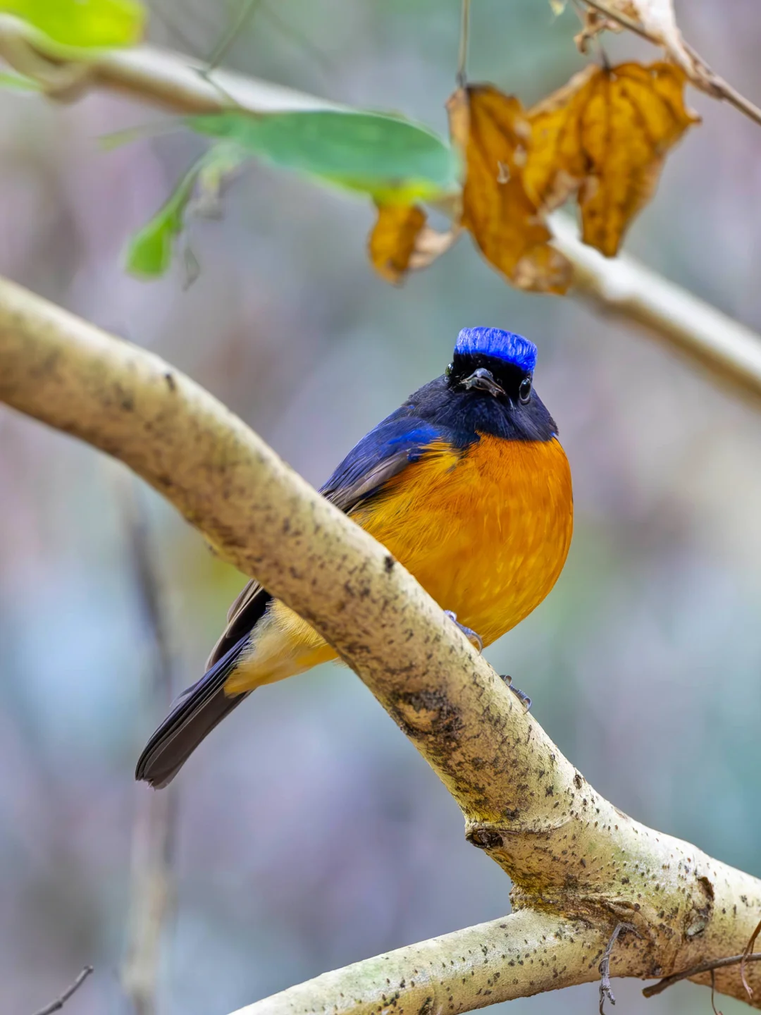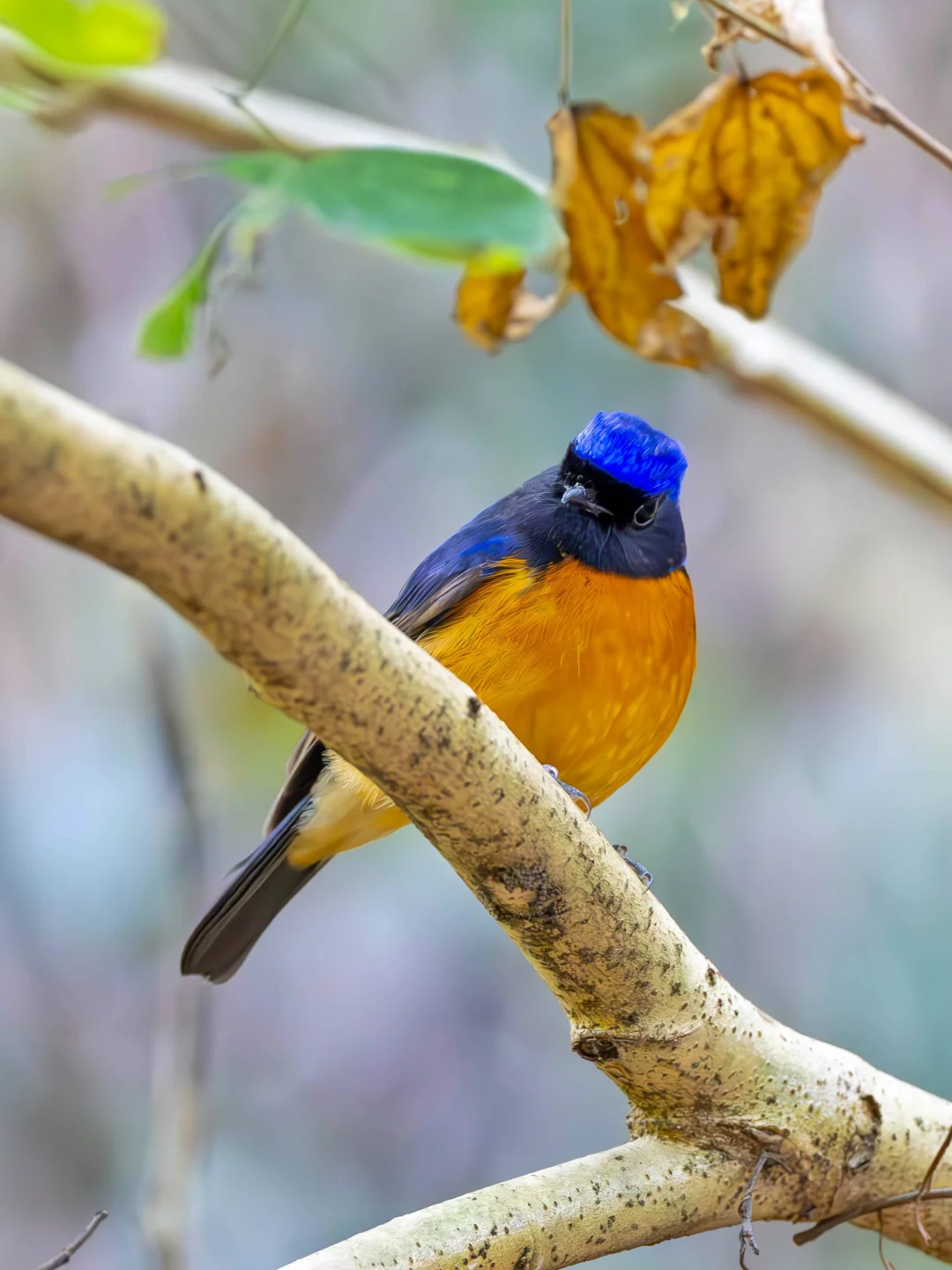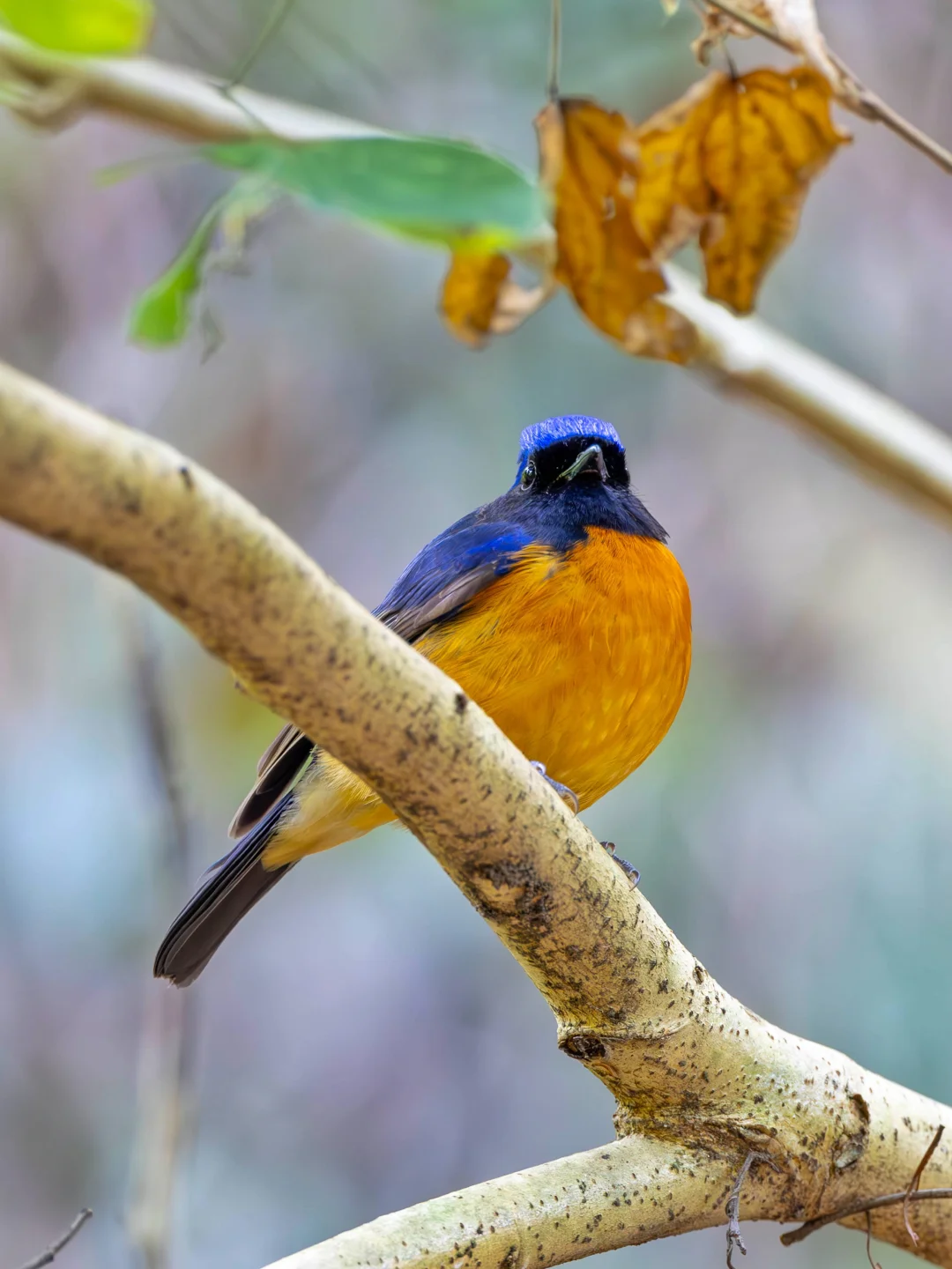 棕腹大仙鹟,雄鸟上体深蓝色,下体橙黄色,非常漂亮。和近似种,棕腹仙鹟相比,它们肩部没有亮蓝色斑块,颜色也更淡。不过总的来说算是高饱和度小鸟了。
