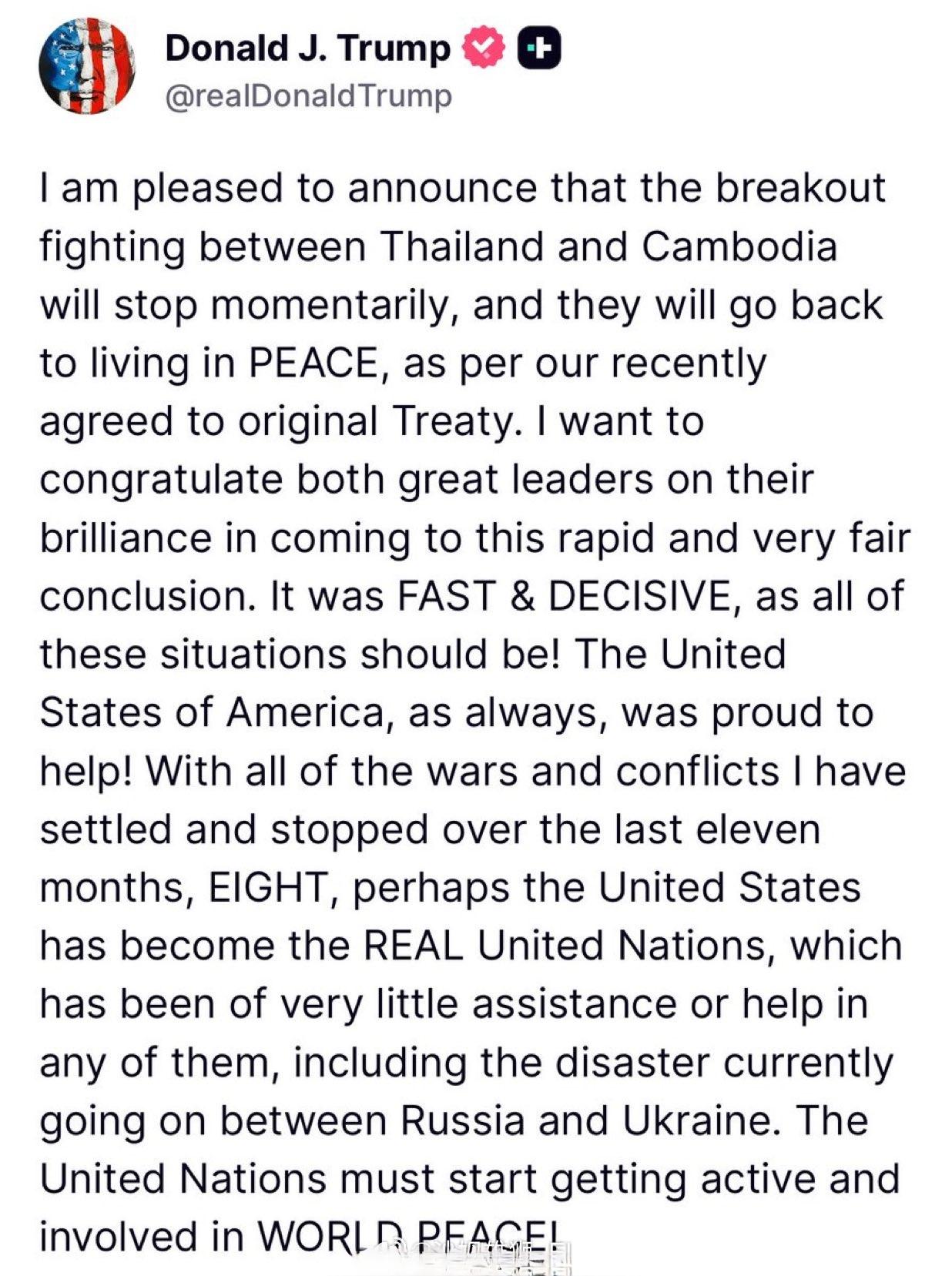 美国总统特朗普谈泰柬冲突: “我很高兴地宣布,泰国和柬埔寨之间的爆发性冲突将暂时停止,他们将按照我们最近达成的原始条约,回归和平共处的状态。 我要祝贺两位伟大的领导人以如此高明的方式迅速达成了这个公平的解决方案。这是迅速且果断的行动,所有类似局势都应该如此处理!美国一如既往地自豪地提供了帮助。 在过去11个月里,我成功调解并终止了多场战争和冲突,其中有8起。或许美国已成为名副其实的联合国,而联合国在这些冲突中几乎未能提供任何帮助,包括当前俄罗斯与乌克兰之间正在上演的灾难局势。 联合国必须开始积极参与维护世界和平的行动!”