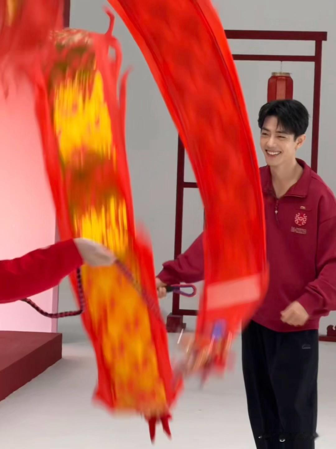 12月29日,肖战穿红衣预祝大家节日快乐,看肖战乐滋滋在直播间学舞龙的模样,一整