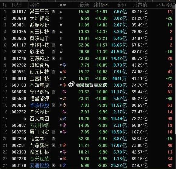 今天A股跌幅榜,24家跌停跌超10%,全A个股涨少跌多,市场个股亏钱效应,个股亏钱效应与指数9连阳背离。跌幅榜跌停股主要集中在近期的高位股,其中消费股,医药股,福建股占据多数,漱玉平民大跌17CM全第一,佳缘科技昨天涨停今天大跌11CM,宏源医药昨天涨停今天大跌10CM,创元科技大跌10CM,圣晖集成大跌10CM,安记食品大跌10CM,华联控股大跌10CM,百大集团大跌10CM,五洲特纸止步3板跌停,厦门国贸止步3板跌停,九鼎新材止步4板跌停。今天的跌幅榜,除了爆炒的商业航天方向的高标继续强势之外,其它方向的高标多数调整,且其它方向高标出来的资金,进入商业航天抱团,商业航天方向整体强度减弱,但核心抱团加强,如总龙头航天发展涨停加速,中国卫星容量百亿成交4连板。按照轮涨,轮跌规律,其它方向亏钱效应,后涨的先跌,接下来先涨的后跌,核心商业航天,接下来调整是大概率,抱团加速,高潮之后就是调整。股票基金股票
