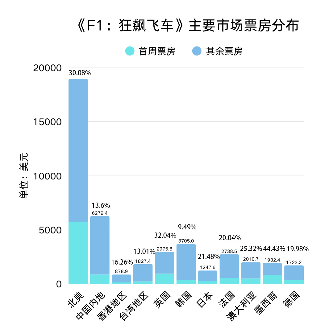 F1:狂飙飞车 在许多市场都表现出了超强的后劲,特别是亚洲市场。最持久的是本片第三大市场韩国,首周票房仅占9.49%,中国内地市场首周票房占比13.6%,也是相当强大了!欧美市场可能本来对F1题材认知度就比较高,开画成绩就已经很好了。