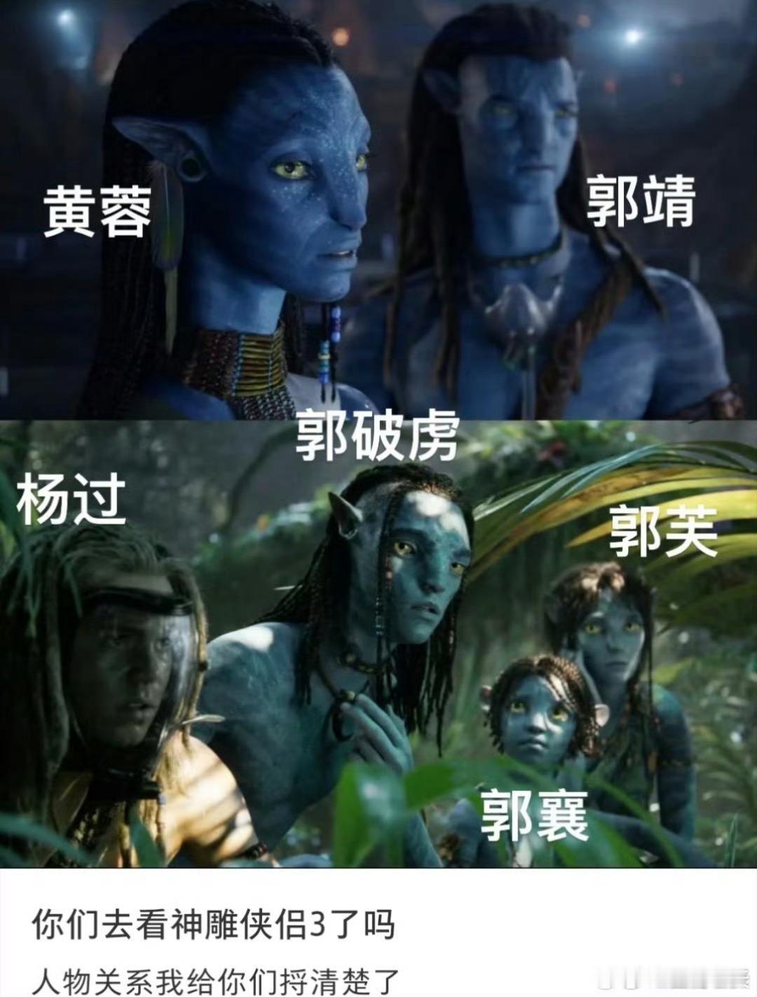 阿凡达3侠之大者 卡梅隆藏着的武侠魂被网友扒光了!杰克对应郭靖、奈蒂莉适配黄蓉,孩子们是郭家儿女,连纳威化进化的蜘蛛都完美代入杨过🤣 东方武侠早为潘多拉史诗写好剧本,这波跨次元联动太绝了!