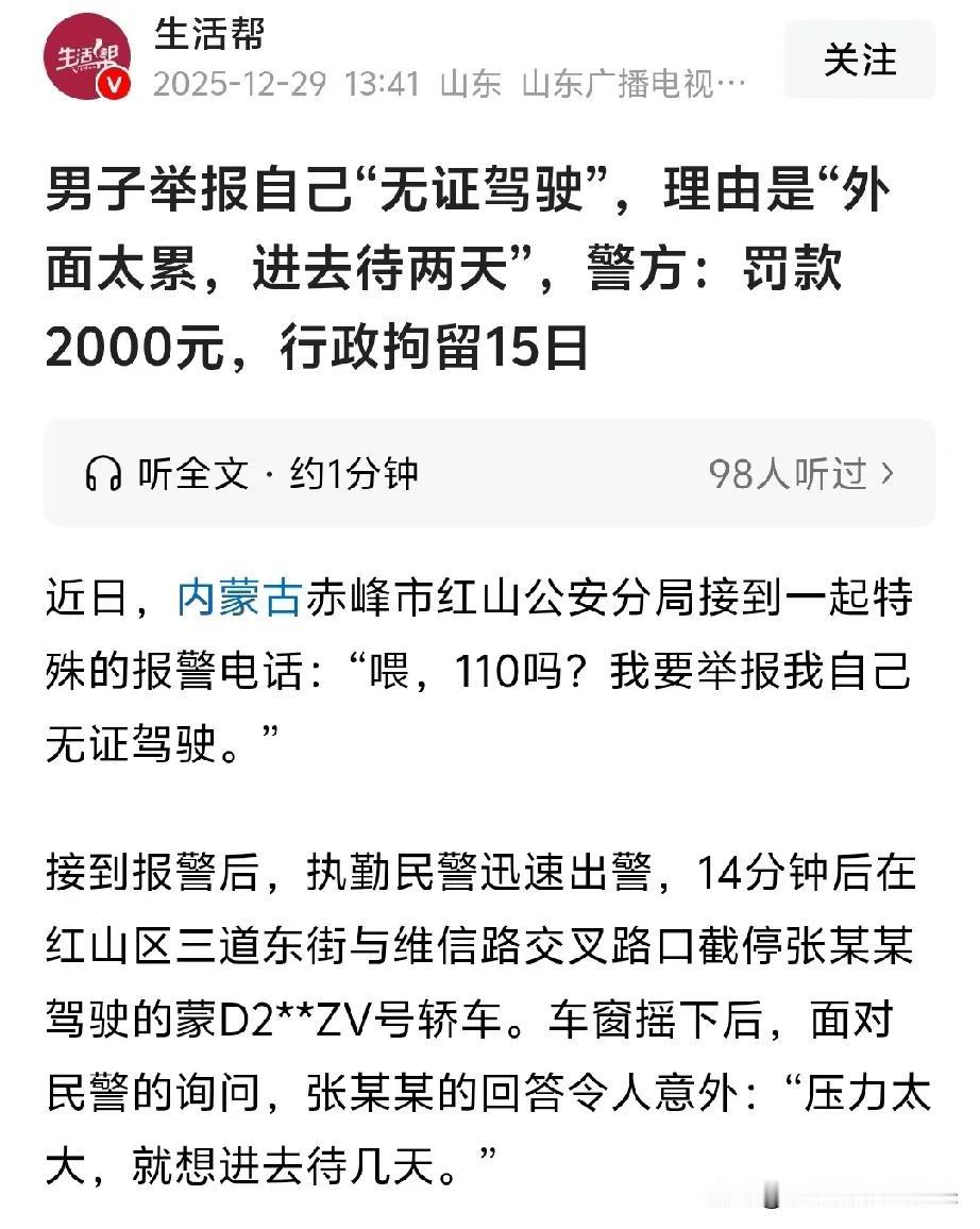 ? 根据报道:男子举报自己“无证驾驶”,理由是“外面太累,进去待两天”,罚款2000元,行政拘留15日! 关于斩杀线我想说三句话! 第一句,哪里都有“斩杀线”,只不过线跟线不一样而已;嘲笑别人的同时别忘了看看自己。 第二句,看不见贫困并不代表没有贫困,只不过是不让你看见罢了。 第三句,很多人特别喜欢用贬低别人来抬高自己,也就是:与其提高自己不如贬低别人。 最后我想说一句,日子怎么样每个人应该都有自己的切身体会!