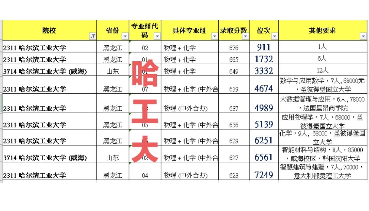 哈工大的超短裙操作真是牛了,2025年高招本部普通批次只在北京投放了7个指标,其他全是高学费的中外合作办学指标。即便这样,哈工大在京录取最低分665分,跟北航录取一两百人差不多。 以下是各专业(组)录取情况的详细情况: 哈尔滨工业大学(本部)·黑龙江·专业组02:选科要求物理+化学,录取分数676分,位次911,招生1人,为该校在黑龙江录取分数最高、位次最靠前的专业组。 哈尔滨工业大学(本部)·黑龙江·专业组01:选科要求物理+化学,录取分数665分,位次1732,招生6人,属本部普通类专业组,分数和位次处于较高水平。 哈尔滨工业大学(威海)·山东·专业组01:选科要求物理+化学,录取分数649分,位次3332,招生12人,是威海校区在山东的普通类专业组。 哈尔滨工业大学(本部)·黑龙江·专业组07(物理+化学中外合作):选科要求物理+化学,录取分数639分,位次4674,包含数学与应用数学专业,招生7人,学费68000元,合作院校为圣彼得堡国立大学。 - 哈尔滨工业大学(本部)·黑龙江·物理中外合作专业组:选科要求物理,录取分数637分,位次4989,包含大数据管理与应用专业,招生6人,学费78000元,合作院校为法国里昂商学院。 - 哈尔滨工业大学(本部)·黑龙江·专业组05(物理+化学中外合作):选科要求物理+化学,录取分数636分,位次5139,包含应用物理学专业(招生7人,学费68000元,合作院校圣彼得堡国立大学)和化学专业(招生9人,学费68000元,合作院校圣彼得堡国立大学)。 - 哈尔滨工业大学(本部)·黑龙江·物理+化学中外合作专业组:选科要求物理+化学,录取分数629分,位次6251,无具体专业说明。 - 哈尔滨工业大学(威海)·山东·专业组02(物理+化学中外合作):选科要求物理+化学,录取分数627分,位次6561,包含智能材料与结构专业(招生8人,学费85000元,合作院校韩国汉阳大学)和智慧建筑与建造专业(招生7人,学费70000元,合作院校意大利都灵理工大学)。 - 哈尔滨工业大学(本部)·黑龙江·专业组04(物理中外合作):选科要求物理,录取分数623分,位次7249,无具体专业说明。 哈工大这么做,是觉得北京家长人傻钱多么?虽然大部分家长付得起中外合作办学的学费,但也不能吃相这么难看吧,就7个普通指标,其他全中外合作。你倒是深圳校区也给几个指标,估计就没多人说了。
