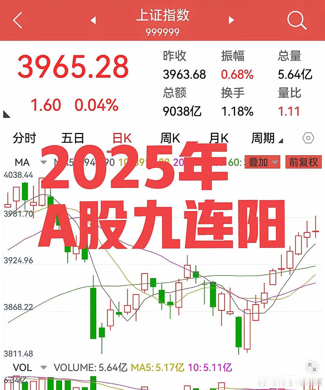 沪指九连阳在历史上单纯出现过4次(2025年此次为第五次),此前四次分别发生在1997年、2007年、2015年和2018年。具体情况如下:1. 1997年:8月20日-9月1日实现九连阳,从1132.91点涨至1229.86点,结束后一个月下跌10.13%。2. 2007年:3月19日-3月29日走出九连阳,从3014.44点涨至3197.54点,结束后一个月上涨15.06%。3. 2015年:3月11日-3月23日完成九连阳,从3290.9点涨至3687.73点,结束后一个月上涨19.14%。4. 2018年:1月2日-1月10日出现九连阳,累计收涨4.46%,后续成为3587点局部行情尾端。