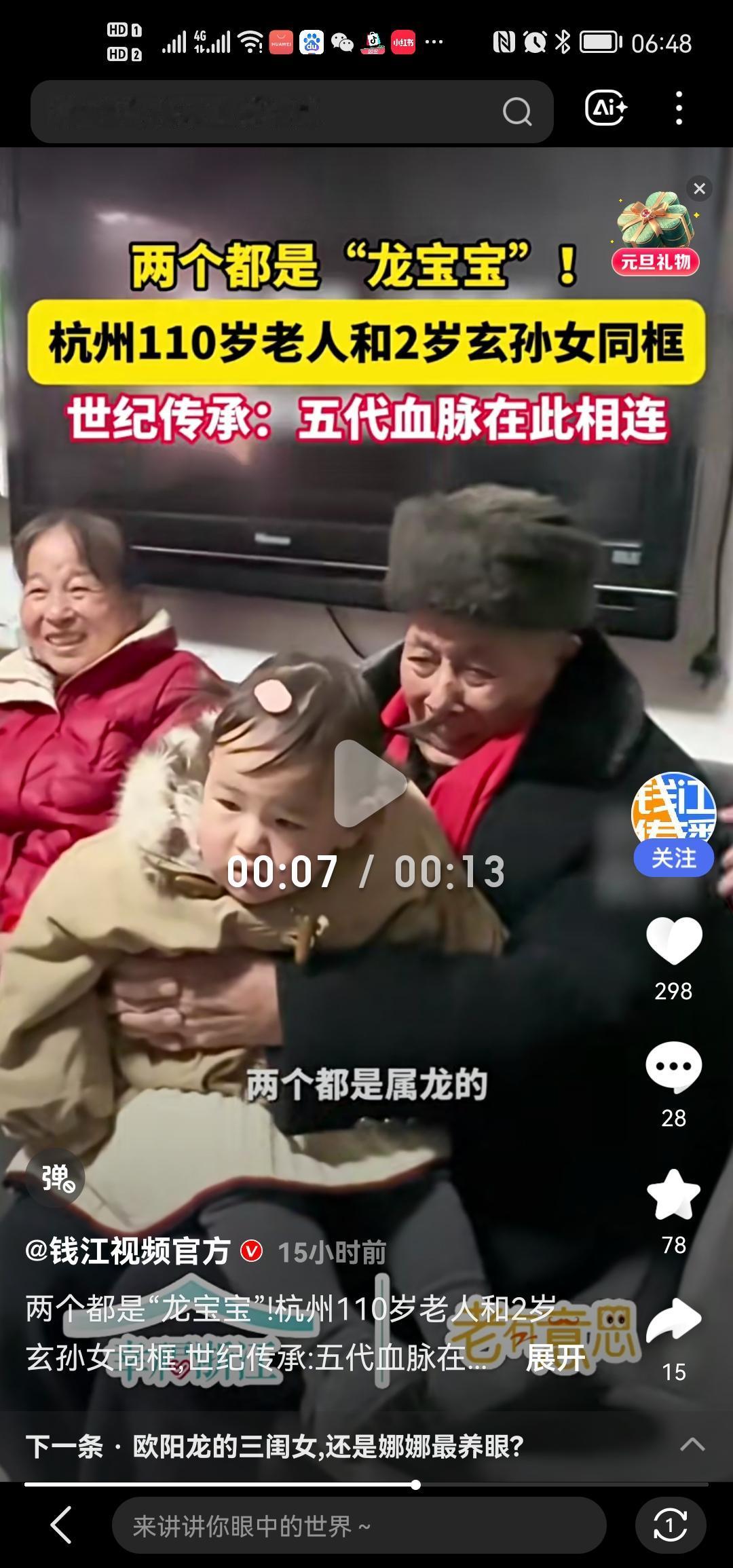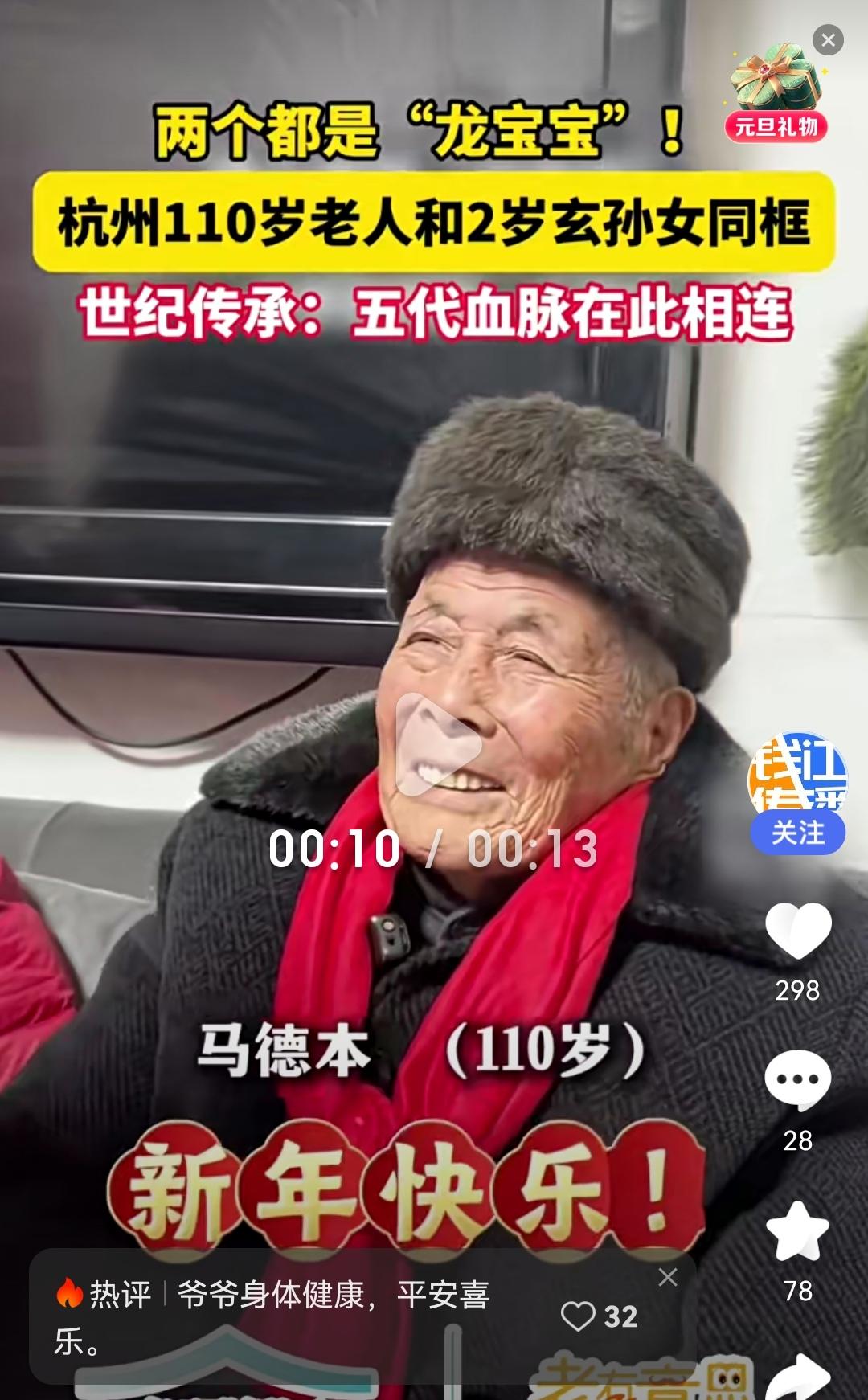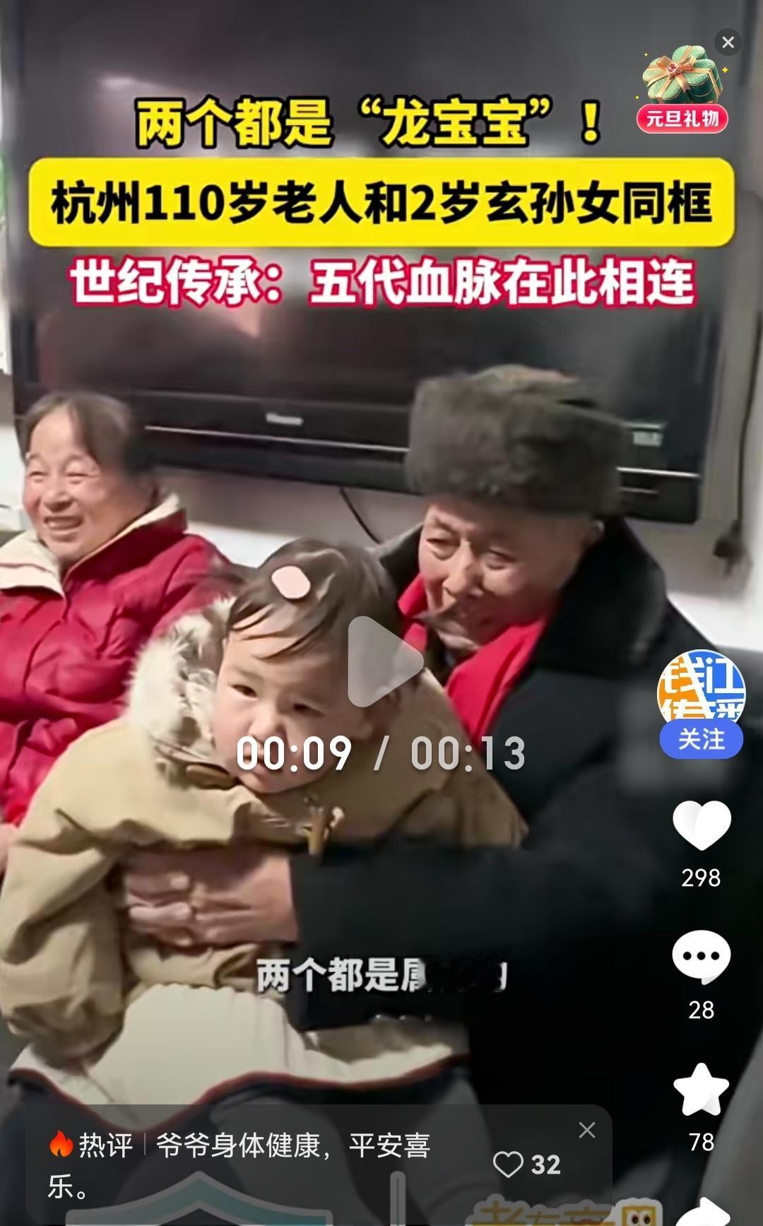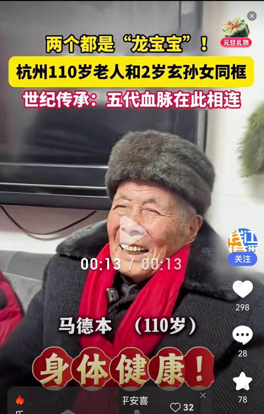 杭州这张同框照太暖了!110岁高龄的奶奶,抱着2岁的玄孙女,两人相差整整108岁,更巧的是祖孙俩都属龙,一龙历百年岁月,一龙迎新生暖阳,这份缘分太珍贵。 老人生于1916年,熬过风雨岁月,守着四世同堂的圆满;小玄孙女2024年降生,软萌可爱,是家里最鲜活的希望。一老一小依偎在一起,满头银丝配稚童笑脸,岁月温柔,血脉滚烫。 这就是最好的家族传承,一辈辈的陪伴与延续,把爱融进血脉里。世间最幸福的事,莫过于看长辈安康,盼孩童成长,岁岁年年,生生不息❤️