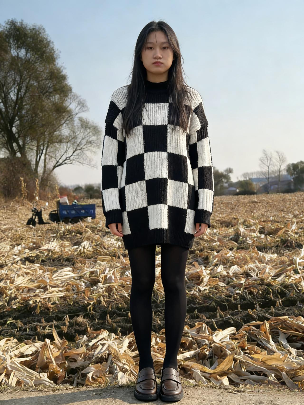 棋盘格毛衣裹着少年的莽撞 玉米地的枯黄,铺成无边的蛮荒 发丝垂落,遮住半分疏离 黑丝与皮鞋,撞出混搭的倔强 ~ 我站在收割后的田野里 把城市的喧嚣,隔绝在白云之上 让灵魂,在荒野里做无拘无束的流浪 风来,便跟着风的方向,轻轻摇晃