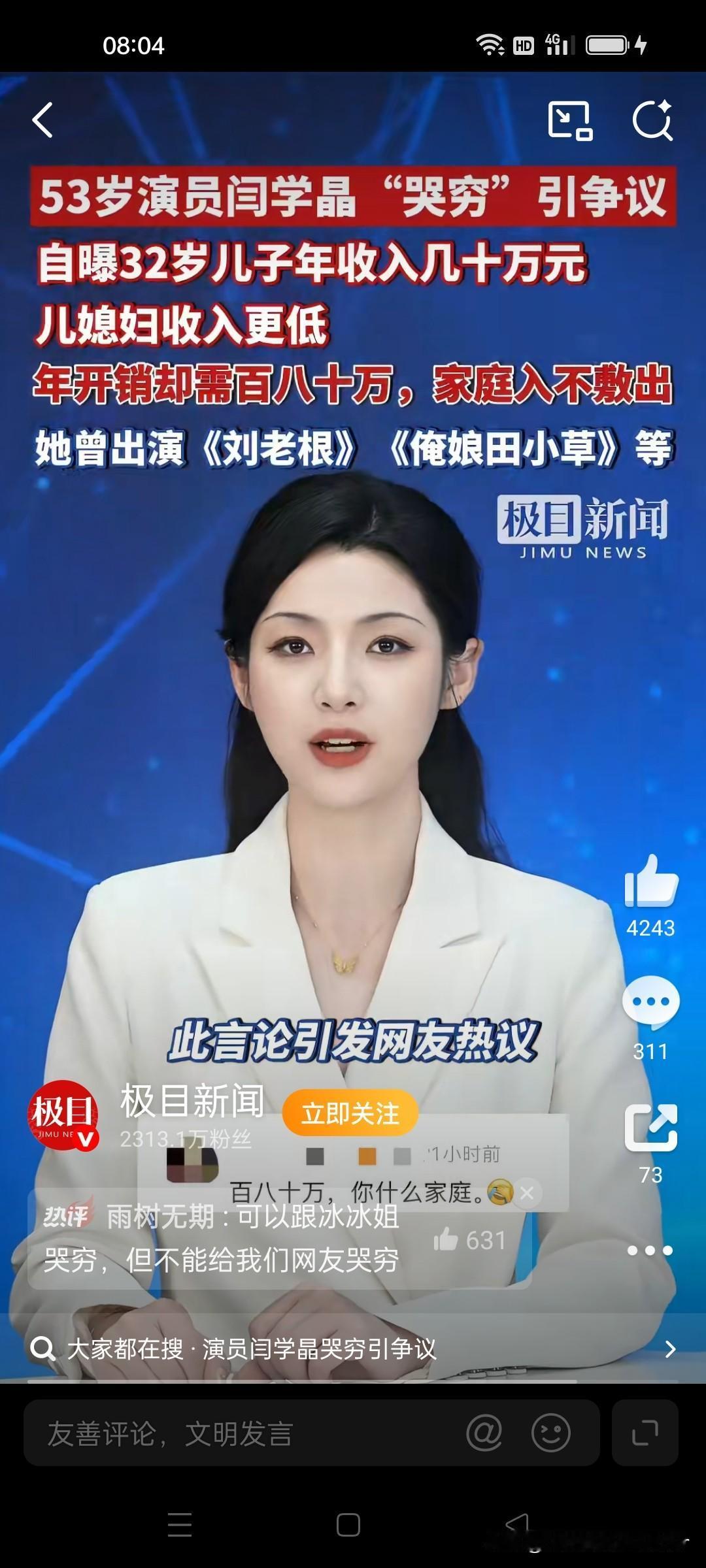 谁能想到!国家一级演员闫学晶直播“哭穷”,直言儿子年入几十万在北京不够养家,引发全网热议~ 本以为是普通家庭的生计焦虑,没想到网友扒出她单条广告报价超12万,名下有多套豪宅,儿子作为星二代已手握资源。几十万对普通人是多年奋斗目标,对明星却成“拮据”,这种阶层认知差才是争议核心。 不是不能有压力,只是脱离大众现实的“诉苦”,难免让人难以共情,你觉得呢?闫学晶回应年入几十万