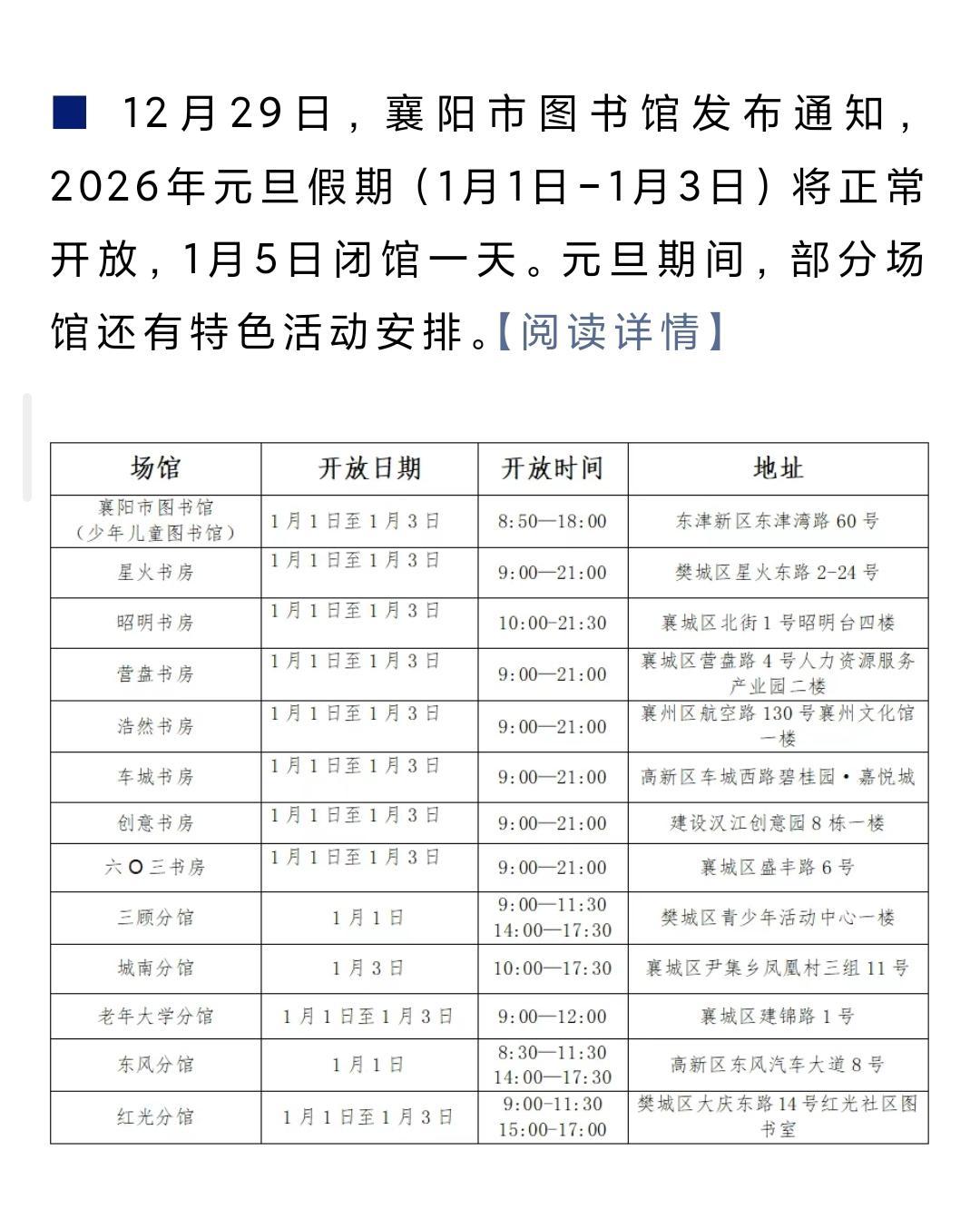 襄阳市图书馆发布通知,2026年元旦假期(1月1日-1月3日)将正常开放,1月5日闭馆一天。元旦期间,部分场馆还有特色活动安排。