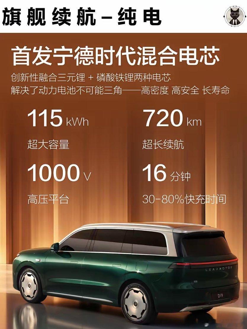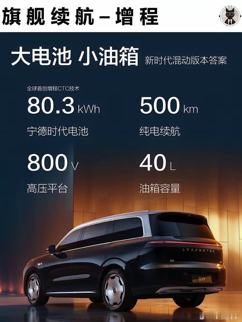 年末9系王炸|零跑旗舰降临零跑科技豪华旗舰SUV——零跑D19正式发布,亮点颇多,在设计、舒适、续航、智能、驾控和安全方面都有独到之处,跟我一起速通发布会关键信息💡1️⃣外观前脸霸气且不乏科技感,而作为旗舰SUV,双拼色车身降低视觉重心,使整车更加修长。百万像素大灯、ISD智慧交互灯幕等科技配置点缀恰到好处,更有巨大的L型前备舱,有220V电源有排水,非常实用2️⃣舒适座椅采用尊界同款同供应商,全粒面头层小牛皮➕半苯胺工艺,支持加热、通风、按摩、零重力座椅等,还有电吸门、小桌板、三排中央扶手、二三排遮阳帘、全电动车规级冰箱等配置,只有你想不到,没有D19做不到。NVH表现可圈可点,时速120,车内噪音仅62分贝,完全不影响对话3️⃣续航D19提供增程/纯电两种动力形式,其中增程版采用大电池、小油箱思路,全球首创增程CTC技术,搭载80.3度大电池,可实现纯电500km续航,非常亮眼。而纯电版更是搭载115度超大电池,可实现720km纯电续航4️⃣智能全球首搭高通8797芯片,且一次就上了两块,算力来到1280Tops,支持本地部署AI大模型,通过仪表、中控、AR-HUD、后排控制&娱乐屏5屏交互。同时支持VLA世界模型辅助驾驶能力,包含激光雷达在内的28个感知硬件和40+项辅助驾驶功能,让我非常期待D19人车共驾的表现5️⃣驾控D19搭载3电机,3秒级加速,而为了匹配强悍性能,各项硬件也特别“硬核”:全铝底盘,前双叉臂后五连杆,中欧团队联合调校,双腔闭式空悬➕CDC➕魔毯,兼顾舒适和运动,更有大陆的线控转向、米其林高性能静音轮胎、四活塞固定卡钳、博世华域R-EPS转向等,浑身都是好货6️⃣安全作为家庭用车,大三排SUV最重要的是安全。D19采用了公路坦克级别的安全用料:九横三纵四连环笼式车身,车身高强度钢和铝合金占比高达83%。电池可以做到短路后72小时内不起火、不爆炸,满足2026新国标要求⭐️总结:D19带着十八般武艺杀入9系战场,无论是设计、舒适、续航、智能、驾控还是安全,都具有独特优势,这是不想让竞争对手过个好年啊,希望所有品牌再接再厉,明年继续开卷零跑D99 零跑D19 零跑D系列 全尺寸SUV
