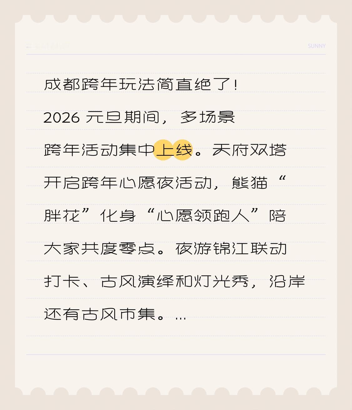 成都跨年玩法简直绝了!2026 元旦期间,多场景跨年活动集中上线。天府双塔开启跨年心愿夜活动,熊猫“胖花”化身“心愿领跑人”陪大家共度零点。夜游锦江联动打卡、古风演绎和灯光秀,沿岸还有古风市集。 成都欢乐谷“星火音乐周”,KPOP 男女团、国风歌手等轮番登场,万人合唱、零点倒数超嗨。而且成都气候“暖而不燥”,白天薄毛衣、夜晚加外套就行。它还把都市光影、艺术盛宴、冰雪激情和悠闲度假完美融合成都跨年打卡地