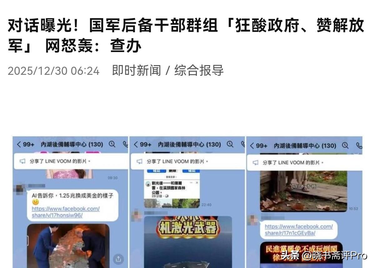 确实让我们没有想到,在我们军演之际,岛内国军后备役干部狂点赞中国装备,“台独”分子破大防!12月30日,根据岛内绿媒报道,绿媒称,台海情势升温,在内有蓝白联手挡“国防预算”,外有中共突袭对台进行大规模军演之际,竟有国军后备干部私下在群组唱衰台湾、跟着蓝白批评赖政府强化国防,相关对话截图29日晚间曝光,引爆“众怒”! 民进党新北市“议员”林秉宥丢出3张聊天室截图,披露了一个来自名叫内湖后备辅导中心的群组,该群组内有人分享中国战机歼-36搭载激光武器系统好棒棒的短片,有些则跟着蓝白酸赖清德“莱尔”,有些则揶揄大罢免,斥责民进党是“独裁党”。很显然,看到这一幕,“台独”分子破了大防,批评称,付这些人薪水干啥?应该查办!看看我们的后备干部都在联系群组里面发表什么言论?这就是黄埔军人?有够扯,有够烂! 很显然,“台独”分子眼中,他们以为岛内国军都会给这些“台独”卖命,“同仇敌忾”,共同对付解放军,但结果呢?结果是,岛内国军不仅不想给“台独”卖命,还非常清楚我们的武器装备实力非常的强悍。事实上,国军后备干部可不是普通的士兵,这些人基本上都是从台军现役军官、士官退役后转入后备役的,一旦有战事或紧急状况,就要被征召归建,承担兵员组织、训练督导、作战支援等任务。 这其实也反应出国军士气非常的低迷,有些心里面可能还是支持统一的。当然,在两岸军力严重倾斜的背景下,替“台独”卖命是最糟糕的选择。“台独”分子心里面想的是统一战争一打响,就立刻跑路,而把国军当炮火。替“台独”卖命,死了不仅没有阵亡抚恤金,并且也不会有任何军功荣誉。事实上,国军也是中国人,如果统一战争打响,国军最好的选择就是投诚。对于此等情景,赖清德估计心里面直冒冷汗。