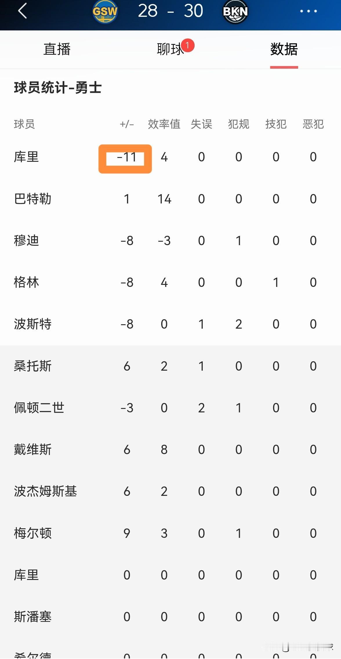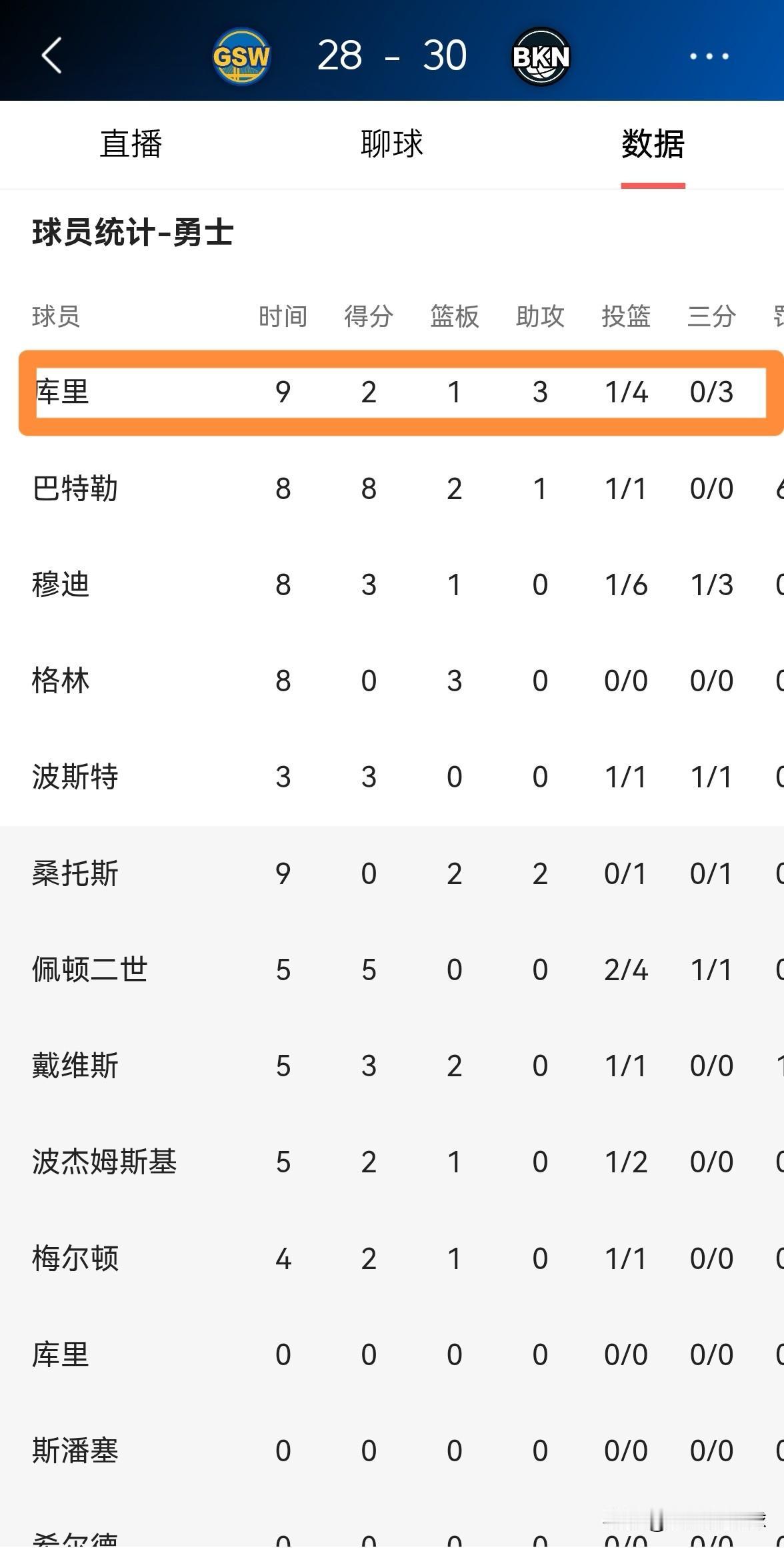 勇士超级巨星库里又拉稀了!在今天勇士客场挑战篮网的比赛中,目前双方的首节比赛已经结束,勇士以28:30落后于对手。在第一节比赛中,库里首发出战9分钟,投篮4中1,其中三分球3中0仅仅得到可怜的2分,他的场上正负值为全队最低的-11。 以库里在第一节比赛中的糟糕状态来看,我预感他会在剩下的三节比赛中继续拉稀。