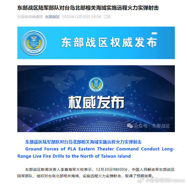 【#东部战区实弹射击取得预期效果#】东部战区新闻发言人李熹海军大校表示,12月30日9时00分,中国人民解放军东部战区陆军部队,组织对台岛北部相关海域,实施远程火力实弹射击,取得了预期效果。