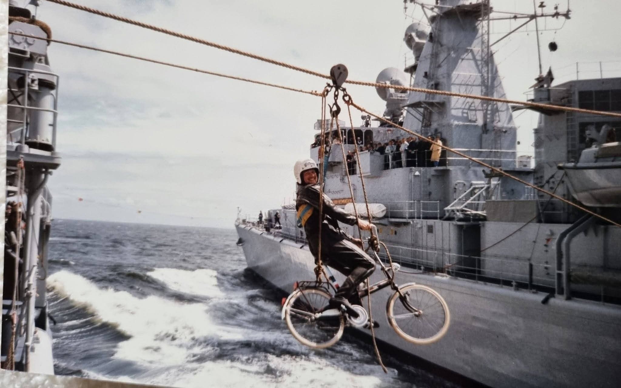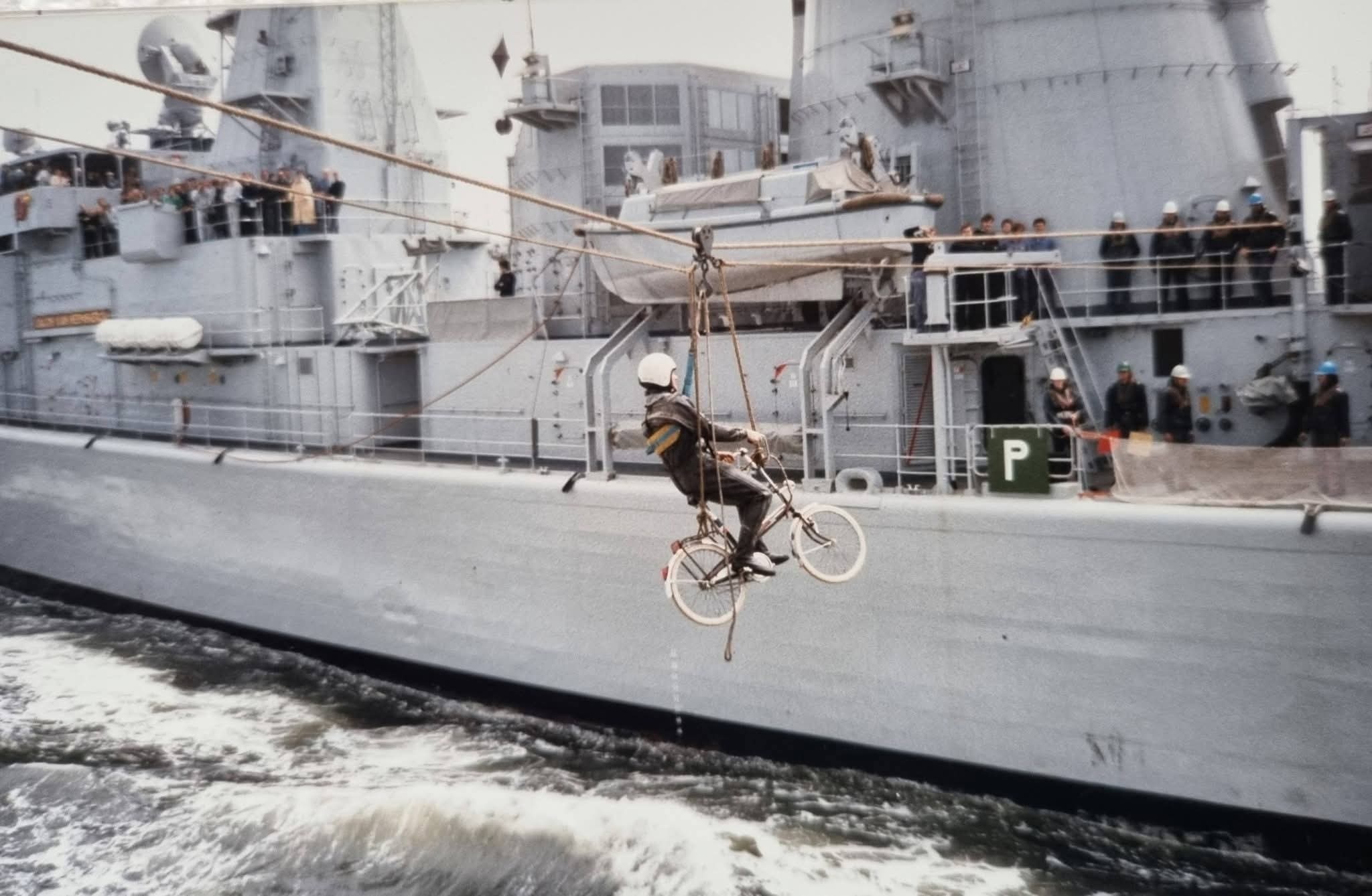 不愧是“自行车王国”,1985年,荷兰皇家海军护卫舰 HNMLS Banckert F810 与 HNMLS Jacob van Heemskerck F812 补给舰进行航行中补给时传递一辆自行车!