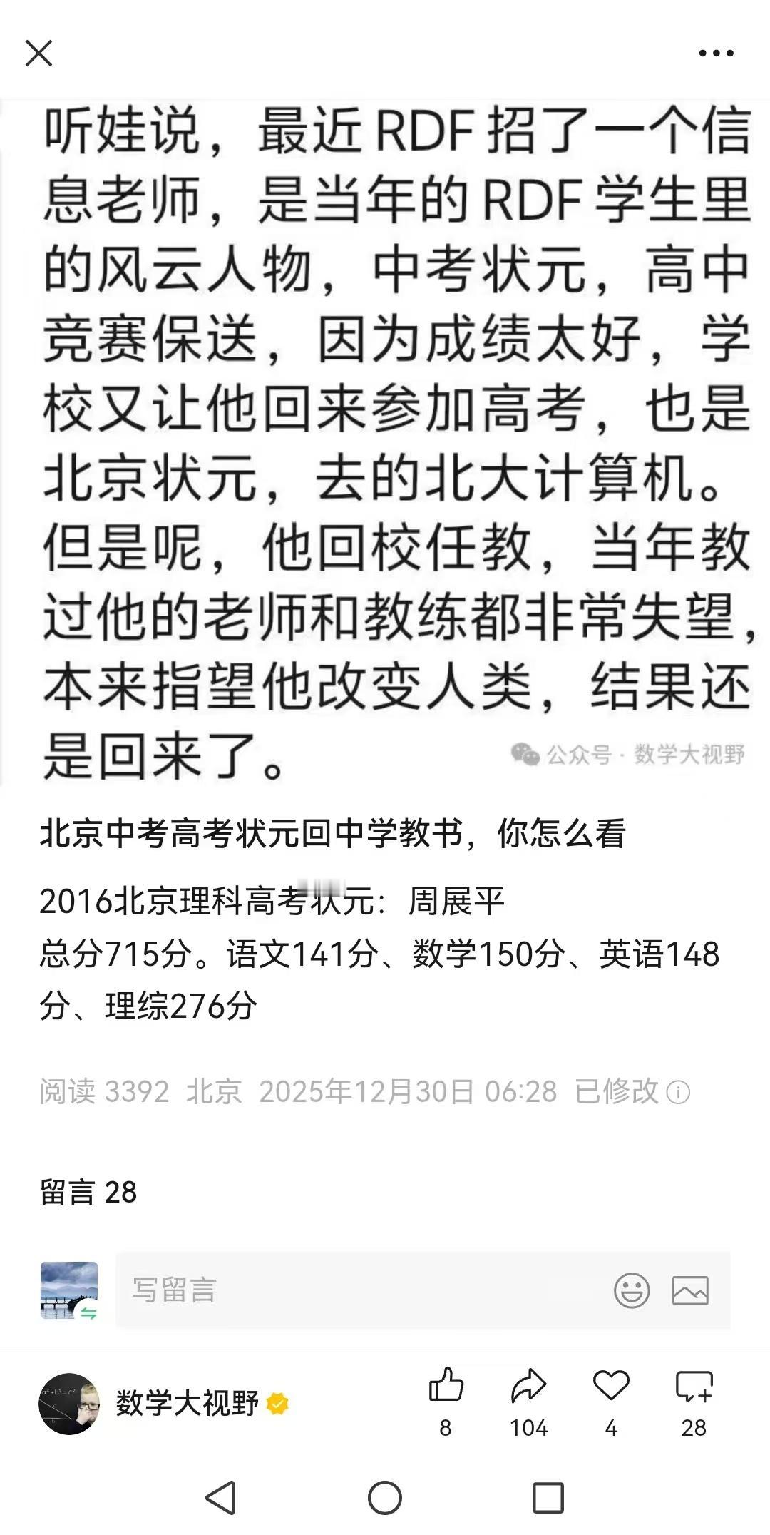什么是拯救世界?难道是老师们教书一辈子比较苦闷,可能理解不了这个选择吗?难道他不是在培养成千上万个改变世界的学生吗?[呲牙] 我一直认为:能改变世界的,绝对不是谁随随便便就能培养出来的,那是独一无二,与生俱来的能力! 中考状元,保送大学的也是人,也是食人间烟火的,从普通人过日子来说,没毛病,很稳妥。哪有那么多改变世界的人呢?