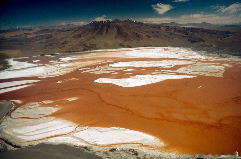 【玻利维亚•科罗拉达湖】湖中有很多硼砂岛屿,这些岛屿的白色和红湖的微红色巧妙的搭配起来,从而形成了一道美丽的风景线。红白相间的湖面,像是一幅油画,将红色和白色画的既抽象又微妙,让人不得不感叹大自然的神奇。红湖还是火烈鸟的栖息地,有3万只每年夏季会在这里安家。