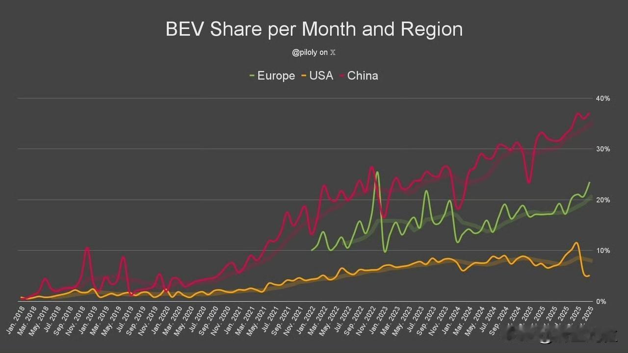美国纯电车比例不增反降,全靠特朗普了,中国比例遥遥领先。欧洲没想到不知不觉也到2