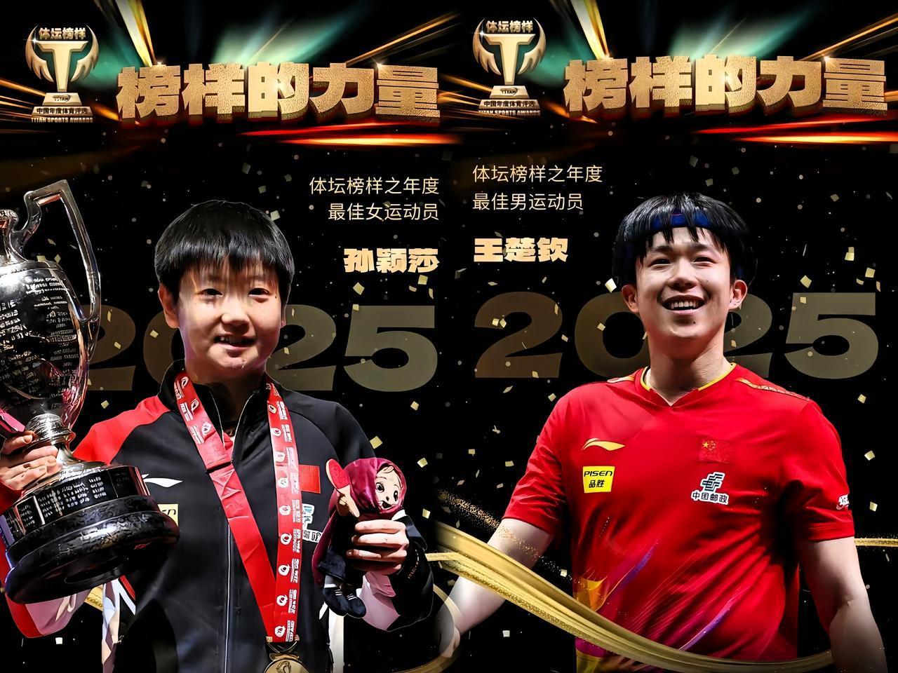 太牛了! 莎莎和大头又获奖了! 刚看到消息, 《体坛周报》2025“体坛榜样”评选结果出炉! 王楚钦当选年度最佳男运动员, 孙颖莎拿下年度最佳女运动员, 俩人还一起把“年度最佳组合奖”收入囊中! 真是实至名归,恭喜恭喜! 孙颖莎获年度运动员