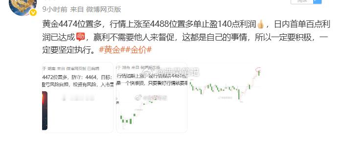 黄金4438位置多,行情如期上涨,现行情报价4453位置,多单顺利浮盈150点利