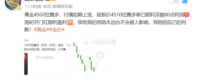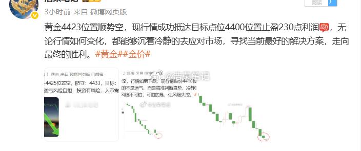 黄金4423位置顺势空,现行情成功抵达目标点位4400位置止盈230点利润,无论