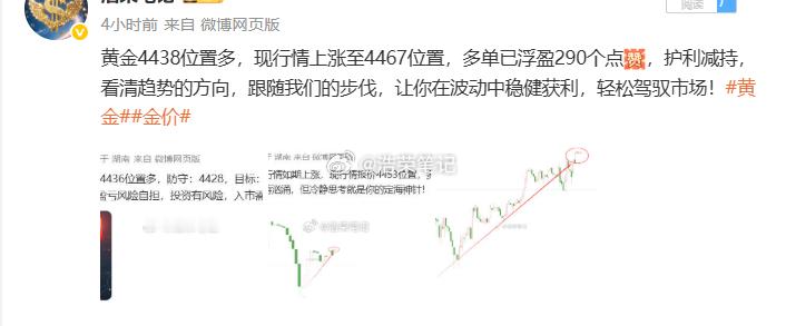 黄金4438位置多,现行情上涨至4467位置,多单已浮盈290个点,护利减持,看