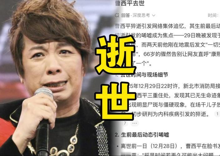 毒舌评委曹西平去世,享年66岁!那些年他在综艺里的“狠言狠语”,如今听来只剩唏嘘 “你不喜欢看到我,我更讨厌看到你,丑八怪!” 这句在综艺里怼得人哑口无言的经典台词,从此成了绝响。据台媒报道,台湾艺人曹西平于29日离世,享年66岁。消防人员赶到他住处时,发现他已无生命迹象,遗体出现明显尸斑与僵硬。 很多人认识曹西平,是从《康熙来了》里那个毒舌又敢说的嘉宾开始。他在节目里从不藏着掖着,对嘉宾的穿搭、表现直言不讳,虽然“狠”,却也凭这份真实劲儿圈了不少粉。后来他又去了《火星情报局》,甚至当起《超级女声》的评委,走到哪儿都是“火药味”十足,让观众又爱又“怕”。 可谁能想到,舞台上永远精力充沛、嘴巴不饶人的他,会以这样的方式离开。这也让不少网友感慨:“以前觉得他毒舌,现在想想,那也是他的真性情啊”“小时候看他怼人觉得好笑,现在突然有点难过”。 曹西平的人生,就像他的综艺风格一样,浓烈又直接。他或许不是传统意义上的“好好先生”,但在综艺越来越“温和”的今天,他的毒舌反倒成了一种独特的记忆。如今他走了,那些曾被他“怼”过的人,那些看着他综艺长大的观众,心里多少都有点不是滋味。 其实,娱乐圈里像他这样有鲜明个人风格的艺人越来越少了。我们怀念的或许不是他的毒舌,而是那份在镜头前不伪装、不迎合的真实。愿他一路走好,那些留在综艺里的“狠言狠语”,就当是他留给观众最后的“特色印记”吧。你对曹西平印象最深的是哪个名场面?评论区聊聊~曹西 曹中平