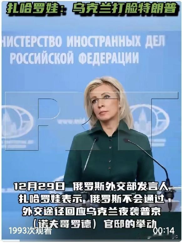 12月29日,俄罗斯外交部发言人扎哈罗娃表示,俄罗斯不会通过外交途径回应乌克兰夜袭普京(诺夫哥罗德)官邸的举动,并指出,此次袭击是乌克兰对美国总统特朗普的“一记耳光”。 ​​​​ 据俄国家总统助理乌沙科夫透露,基辅方面对其位于诺夫哥罗德州的官邸发动的无人机袭击,是泽连斯基在海湖庄园与特朗普会谈刚刚结束之际,这个时间绝不是上“纯属巧合”,而是经过精心策划的有预谋的行动。 正如扎哈罗娃所言,是乌克兰对美国总统特朗普的“一记耳光”。 ​​​​ 由此推断,此次海湖庄园会谈,泽连斯基想要得到的没有得到,而且还被当面指责(或者说羞辱)。从当时的现场视频可以清楚地看到泽连斯基的表情变化:嘲笑、愤怒、强压怒火,不敢硬刚。忍无可忍,无需再忍,因此就是把备选方案拿了出来——袭击俄总统普京官邸,打脸特朗普,发泄不满情绪,报一箭之仇。 得说泽连斯基是一个血性男人,血性男人虽然是对男人的称赞,但有血性的男人不一定就是好总统。 视野、胸怀、格局、韬略都有吗? 就是一介莽夫。