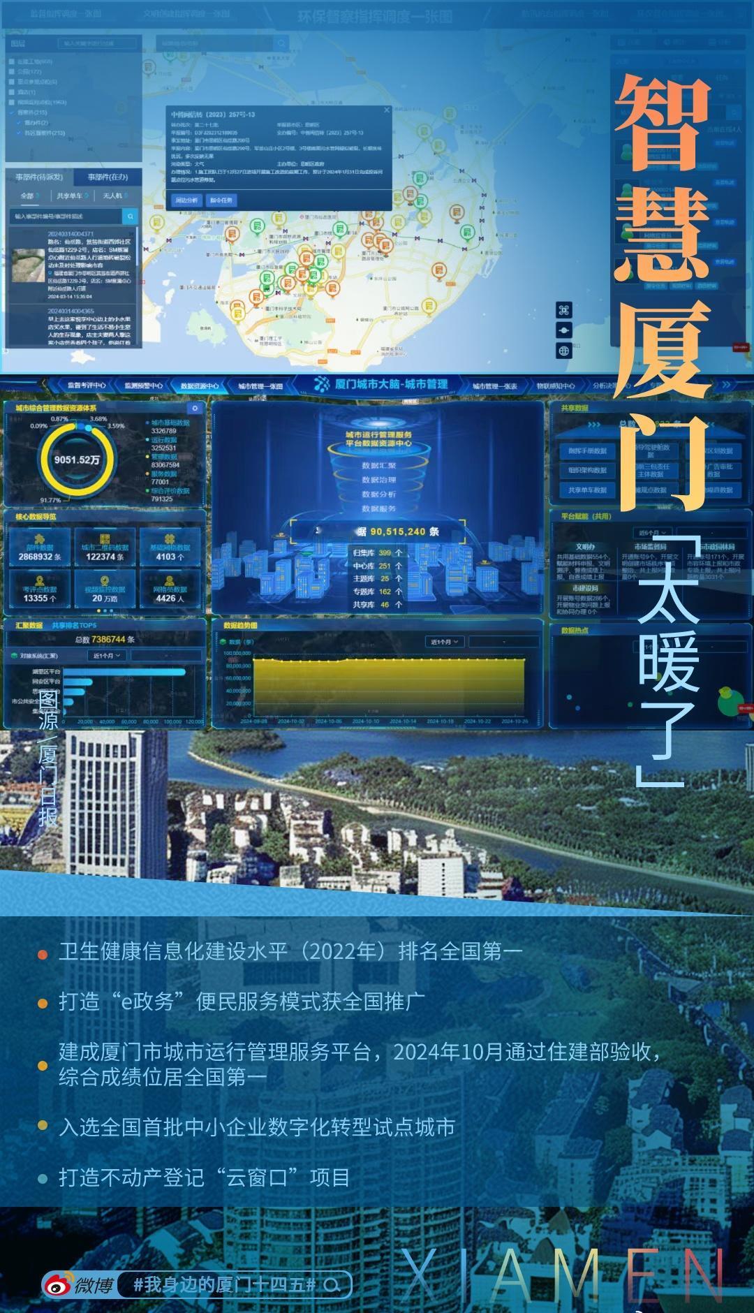 厦门城市运管服平台的出现,就像给城市管理装上了“智慧大脑”:噪声超标会短信提醒,广告牌倾斜3.15°立即发出警报……目前平台现已集成12个行业部门56个子系统,接入路面视频、智能巡查车,共享10.9万个物联感知设备数据,初步具备物联感知、运行监测等11种能力,基本实现城市运行管理“一网统管”。这几年的城市管理,越来越像“隐形守护者”,默默让这座海滨城市更从容。