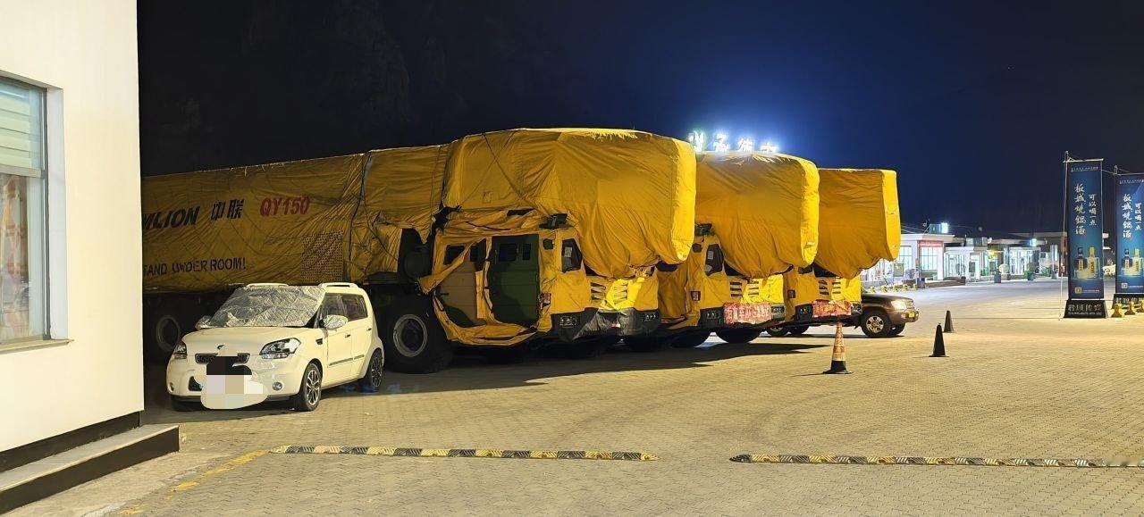 服务区里停放着这么多的中联重工的运输车,从轮子可以看出,这应该是一辆重型起重机运输处,超过9轴的重型底盘,估计起重重量超过6100吨。旁边含有一辆霸道越野车,应该是包工头开道用的。