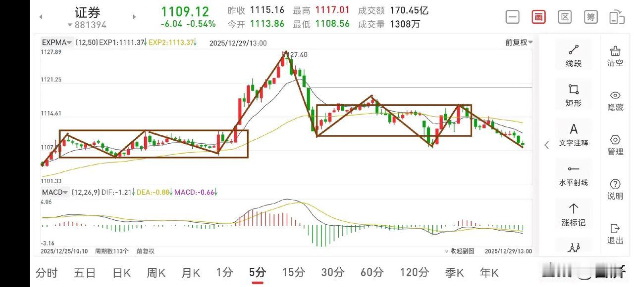 聊聊证券板块(2025.12.29) 今天证券板块先于大盘进行了进一步的回调,由于是2025年的最后三个交易日,预计跌幅不会很大,看来收年红K线是没有问题的,但元旦过后,大家悠着点儿,大概率会迎来一波下挫,所以,此处虽有抵抗,但依然维持看空的观点不变。 1.从30分钟图一上看,目前正在回踩30分钟一笔,离进入下方中枢区间只有一步之遥,截止上午收盘,这笔30分钟回踩还没有结束,下午进入中枢区间几乎以成定局。也就是说之前的日线一笔反弹理论上已经结束了,除非出现重大利好,才会继续上涨,但这种概率是很小的。 2.从5分钟图二上看,上午构建了一个5分钟的下跌趋势,目前正在走离开段,这笔离开段应该会比较强劲,所以此处的风险较大,但由于是最后三个交易日,在下挫后预计会迅速拉回,然后围绕5分钟中枢做延伸,其实就是消耗时间,以时间换下跌空间,所以元旦过后,行情是不容乐观的。 总之,在买点没出现之前,可以忽略它的波动,耐心等待大机会的来临。证券板块动态 在股市,什么是证券投资的王道